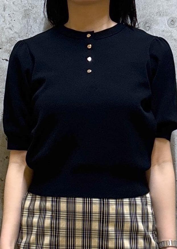 襟は詰まりすぎないクルーネックで、控えめな金ボタンがポイントになっています。前後2way。