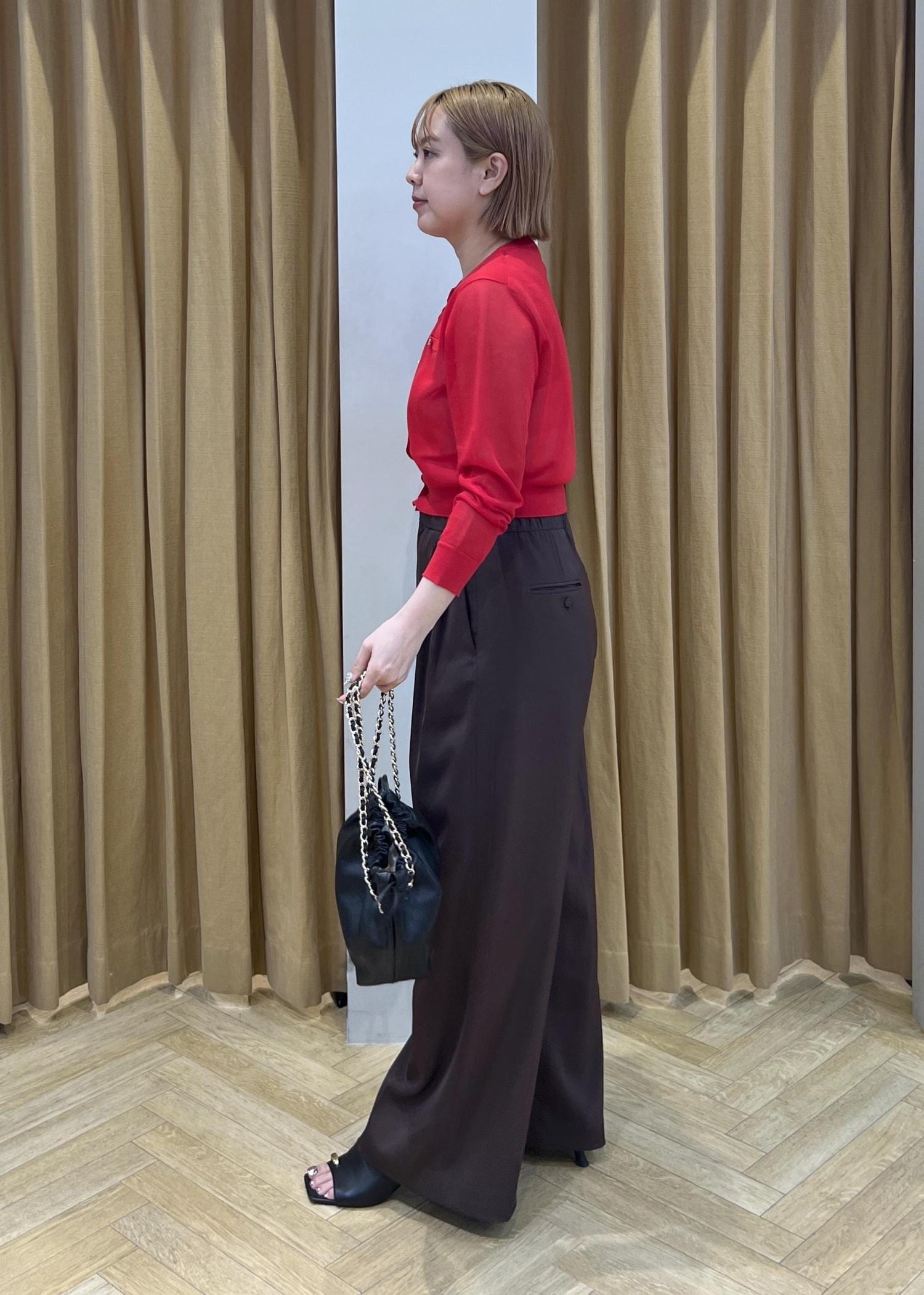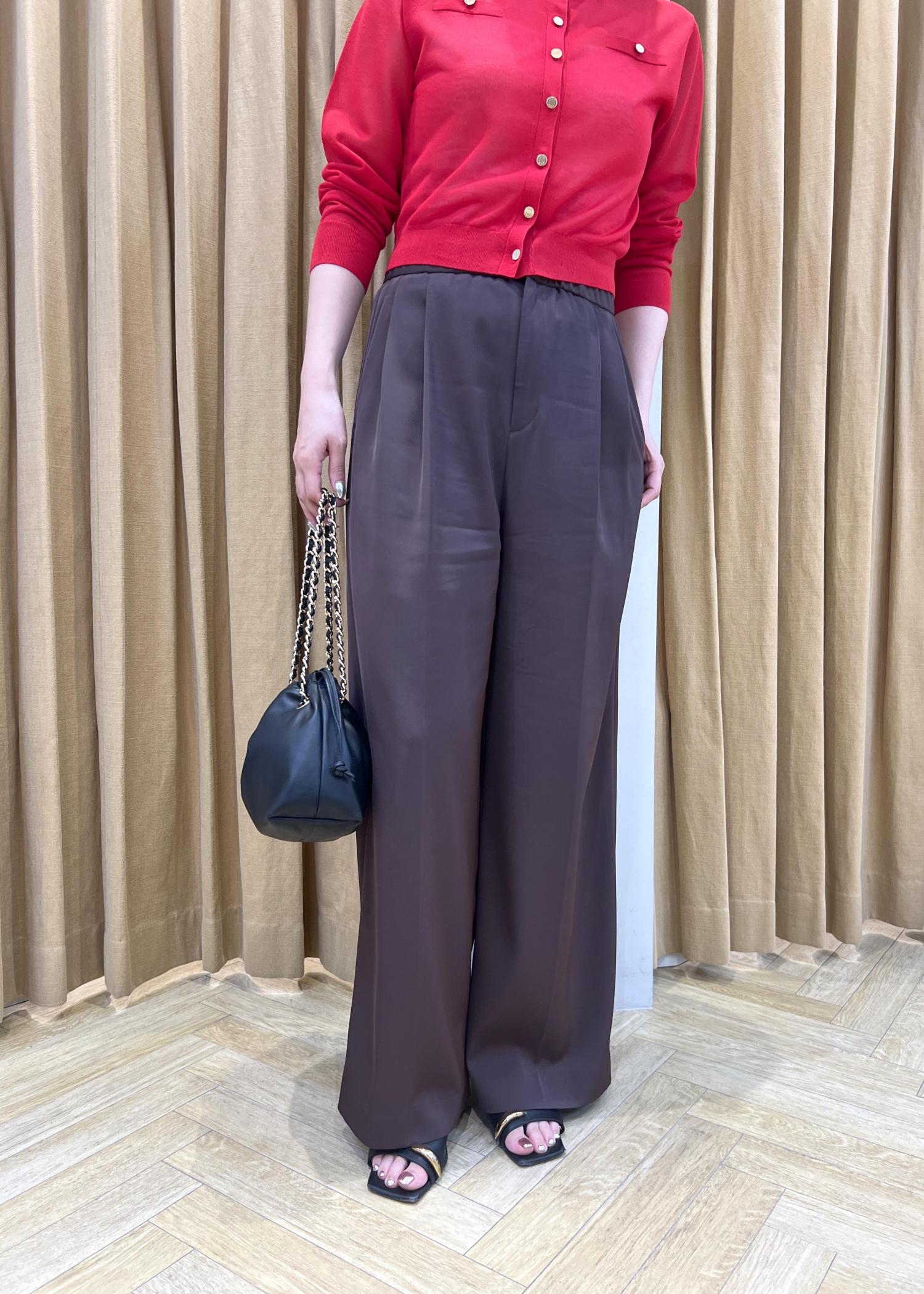 深みのあるブラウンのワイドパンツを合わせることで