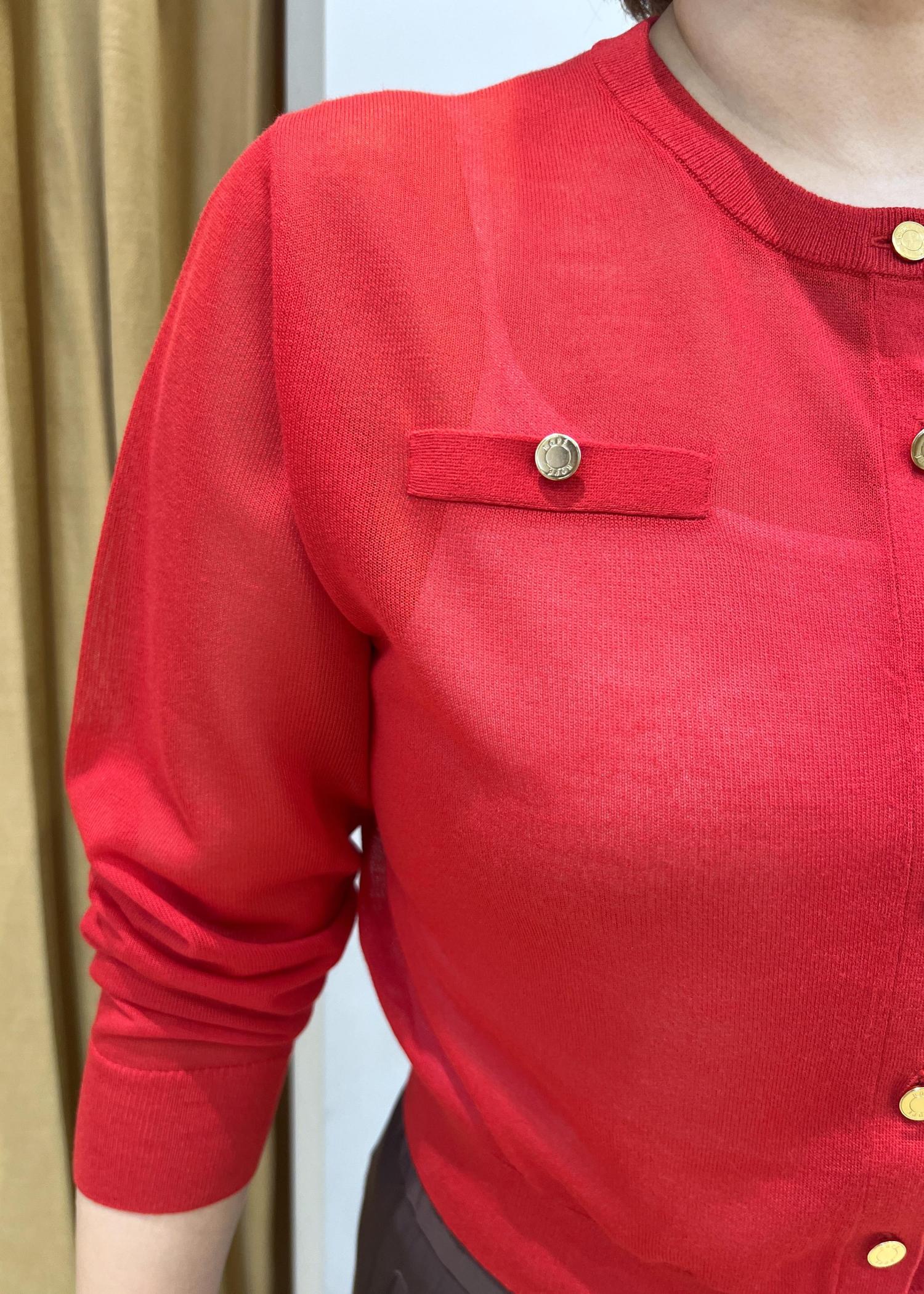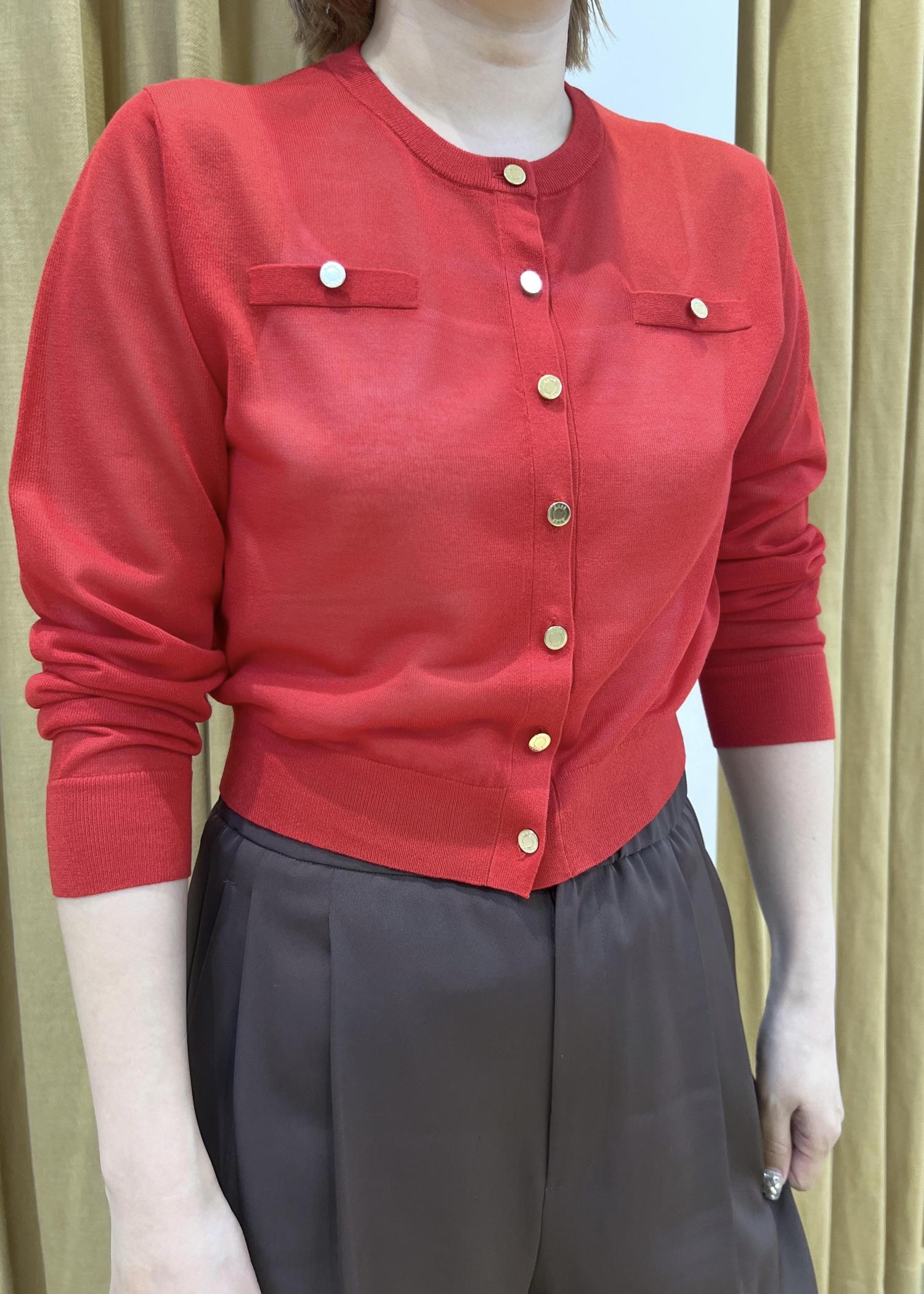 NEW!ROPÉLEVITA 金ボタンクルーネックシアーカーディガン/接触冷感・イージーケアレッド / F¥20,900レビュー腰骨辺りの着丈でコンパクトなサイズ感ですが