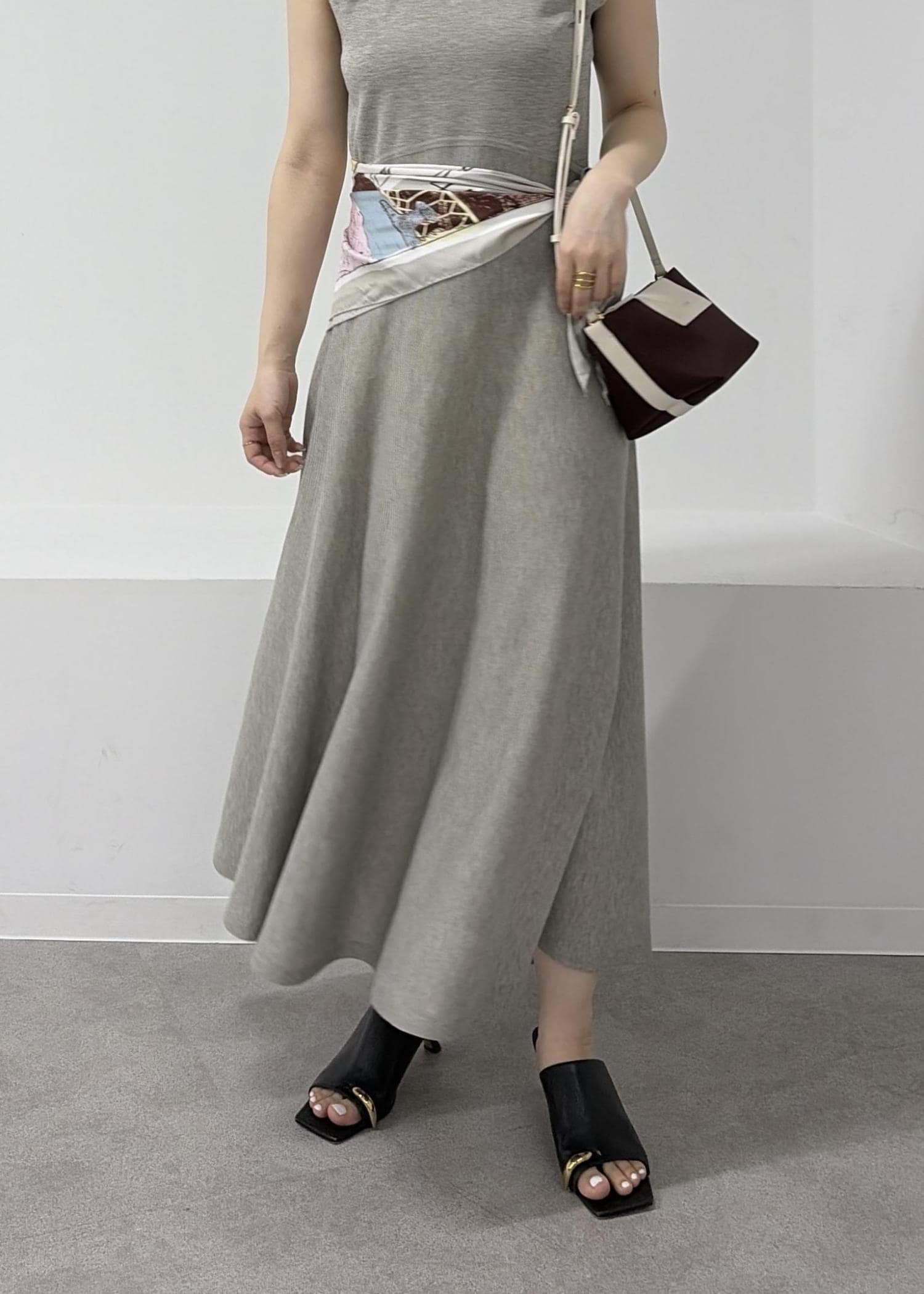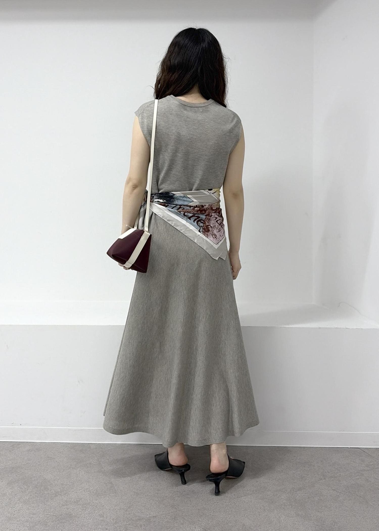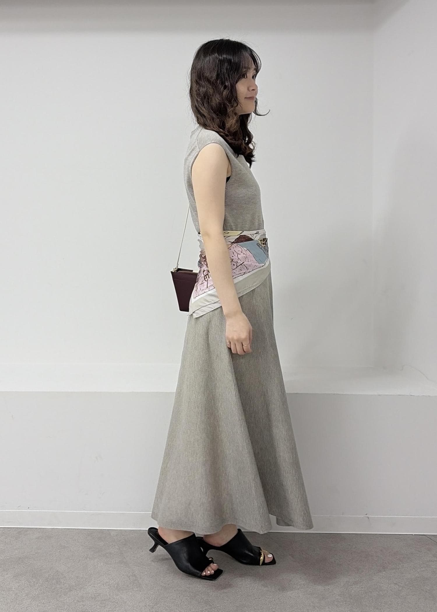 着丈はふくらはぎ真ん中より下あたり。上半身は程よいフィット感あり。高めのウエスト位置からAラインに広がるシルエットなので、お腹周りは気になりにくいです◎