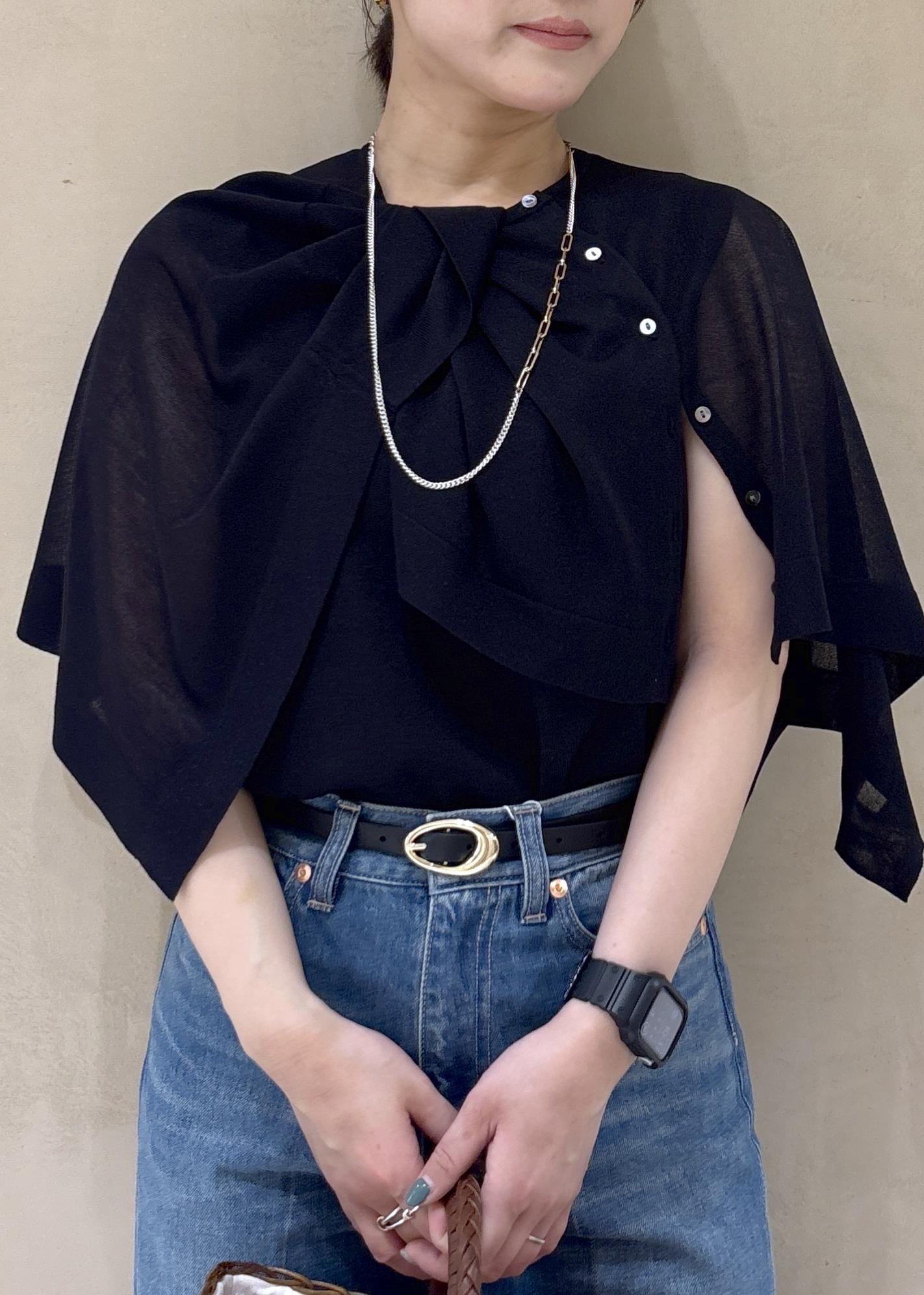ケープはアレンジも楽しめます!一回ネジってからボタンを溜めてドレープを作って着るのがオススメです。