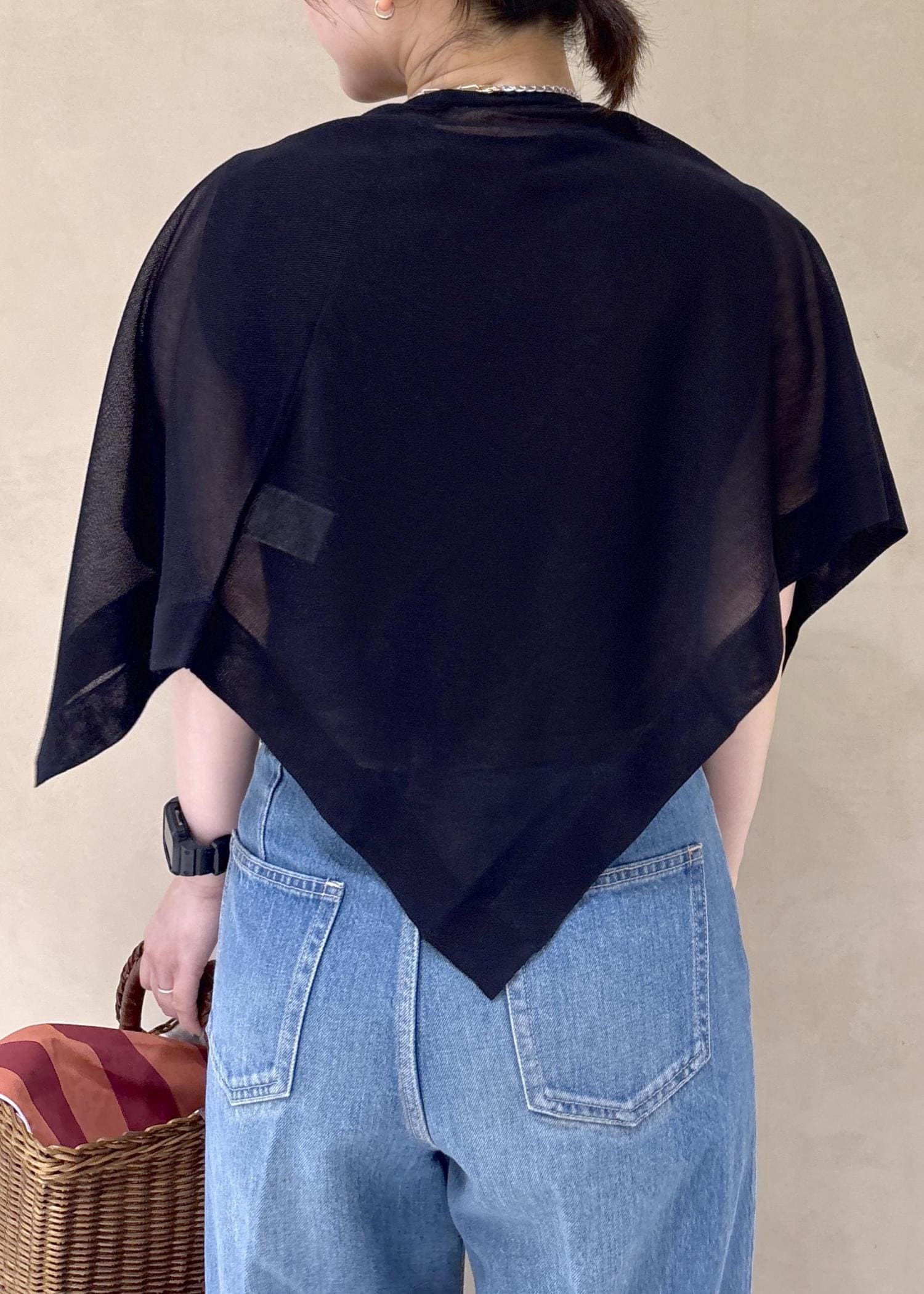 袖のないワンピースの羽織にしたり、シワになりにくいのでバッグに入れておいても便利です。 -