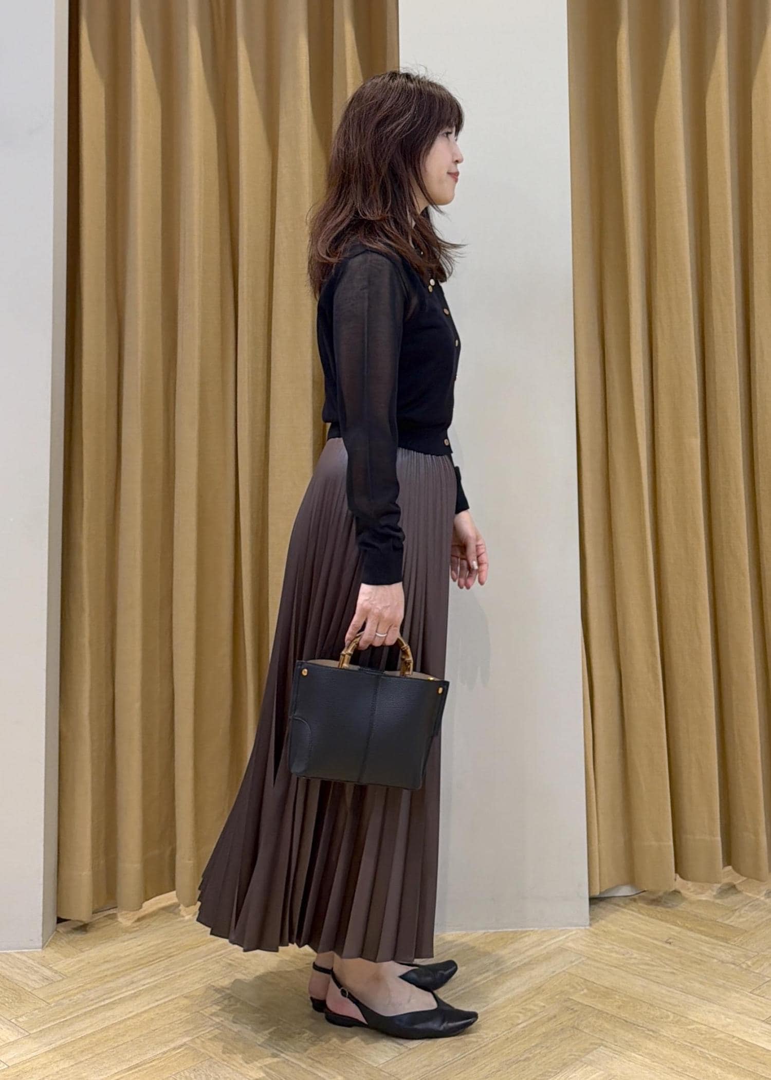 コンパクトでスッキリなカーディガンは少し広がり感のあるプリーツスカートともバランス良く着れます◯
