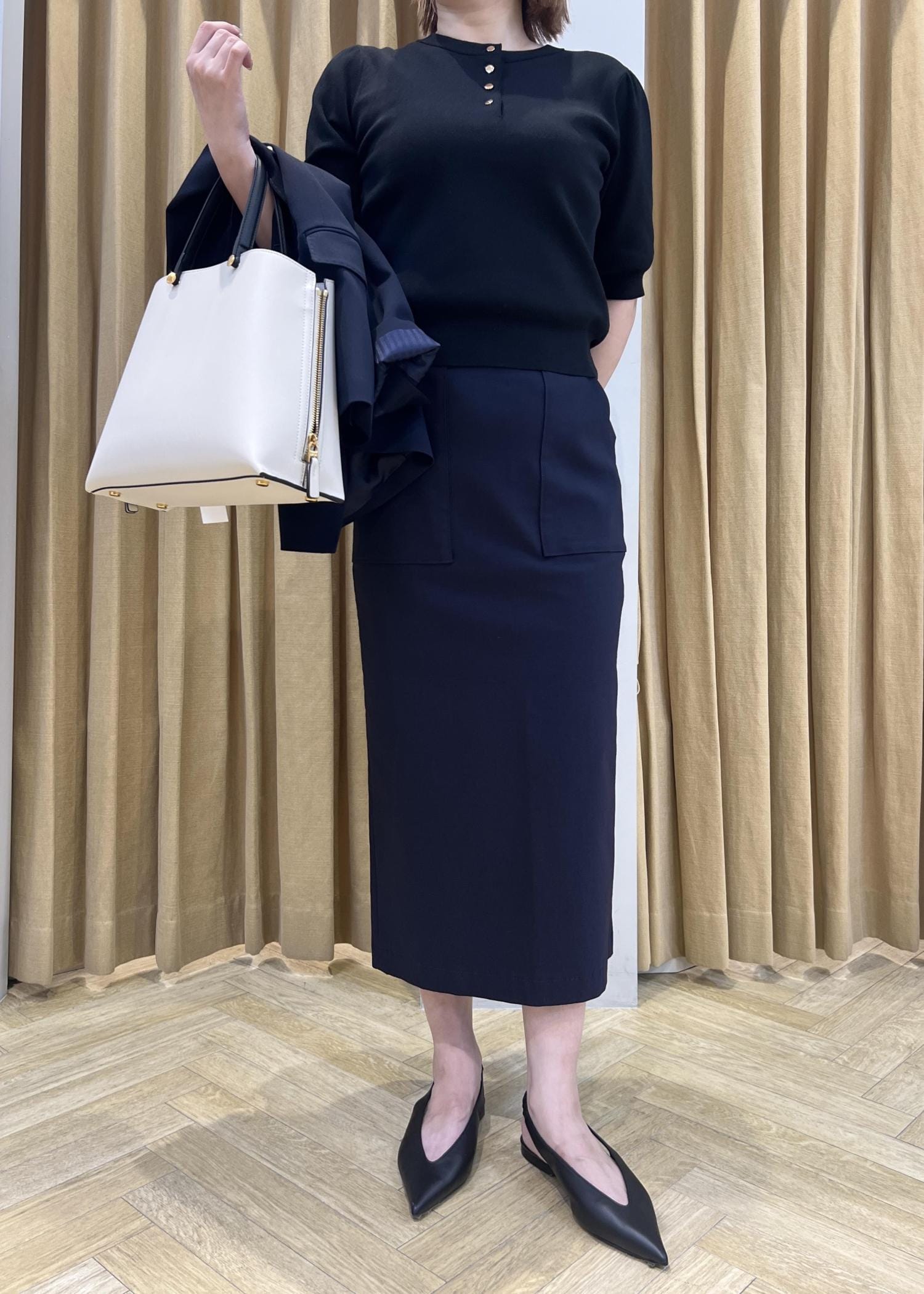タイトスカート合わせで全体をすっきりとまとめて好印象に。