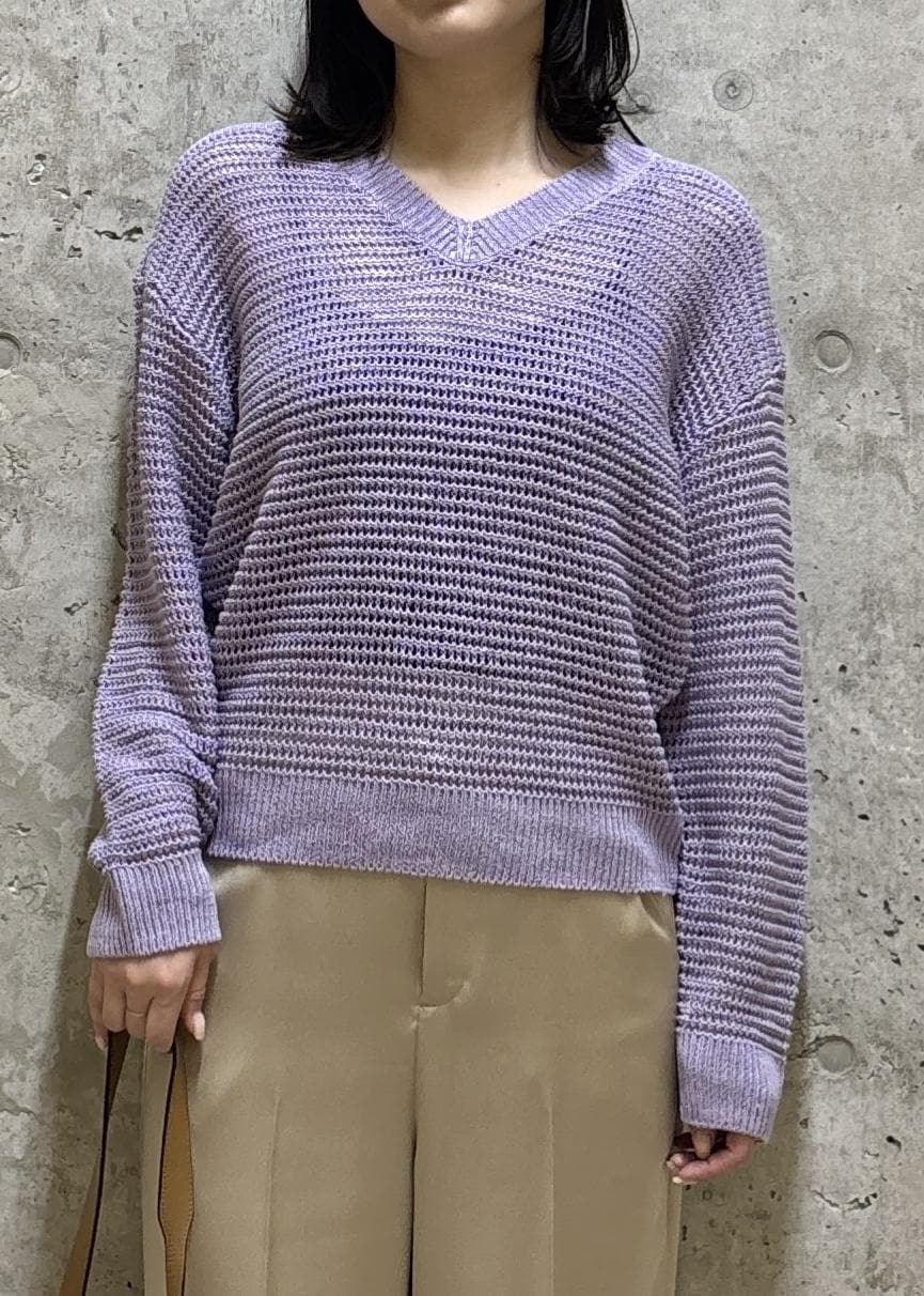 リネン100%の肌離れのよい素材感。麻特有のチクチク感などはなく柔らかく、ざっくり編みなので通気性も良いです◎