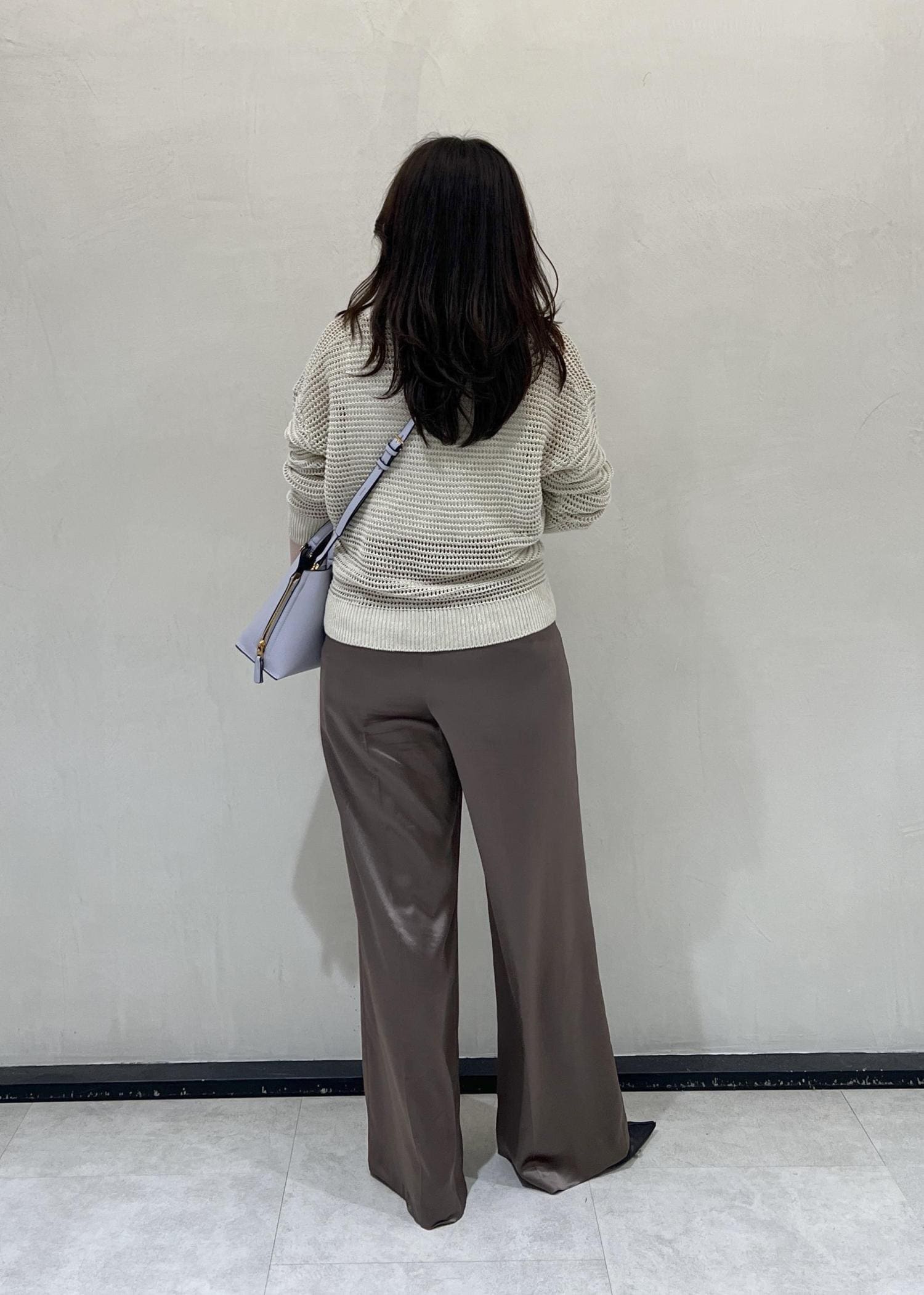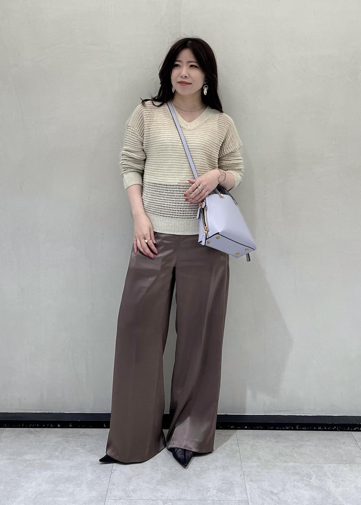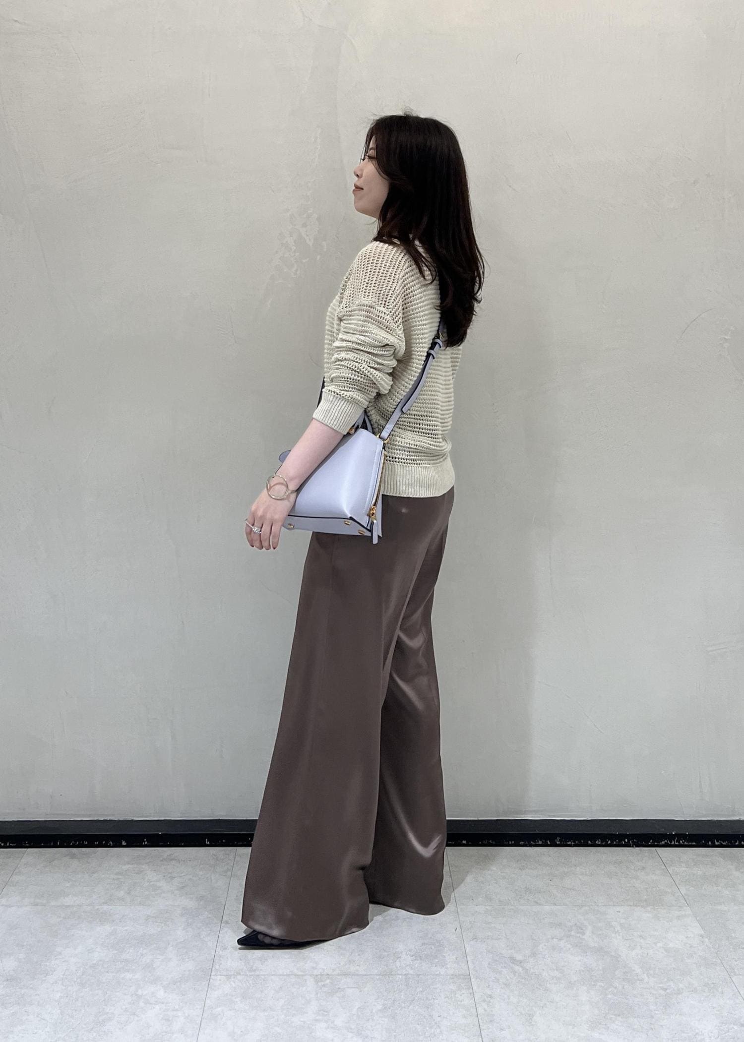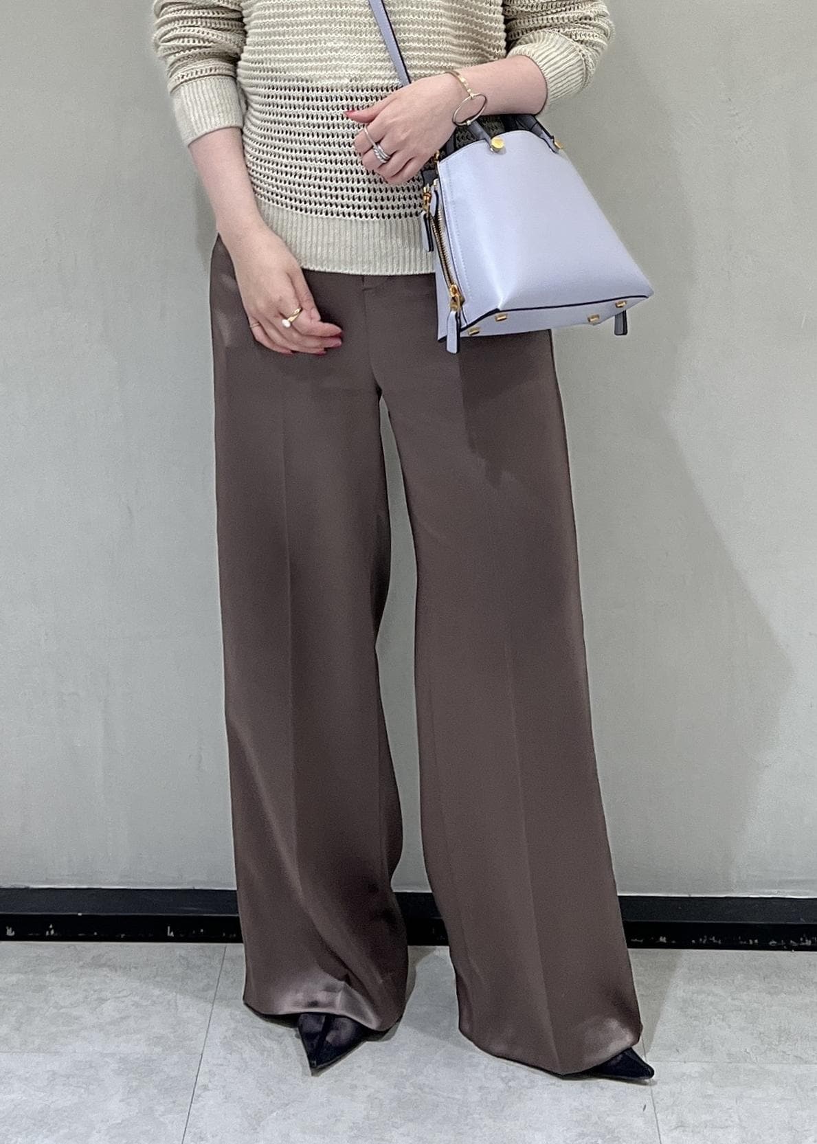 ROPÉドレープサテンイージーパンツ/セットアップ対応・イージーケアキャメル系 / 38¥25,300レビュー品の良い光沢のあるサテンの滑らかさと落ち感が素敵なパンツ。