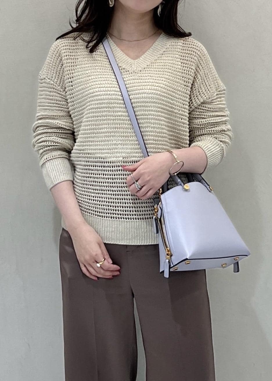 ROPÉリネン畦編みVネックニット/イージーケアベージュ / F¥24,200レビューリネン素材のローゲージのざっくりとしたメッシュ編みニット。