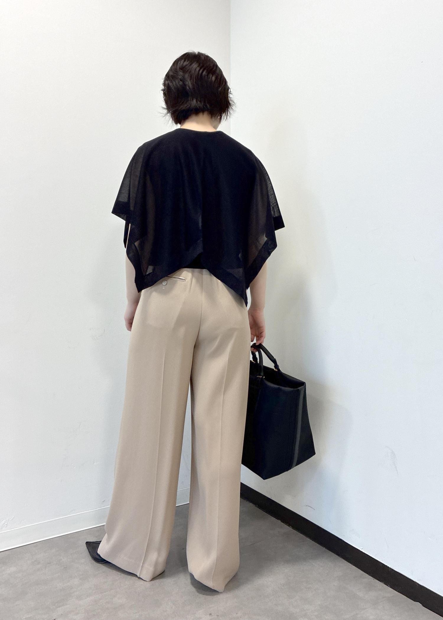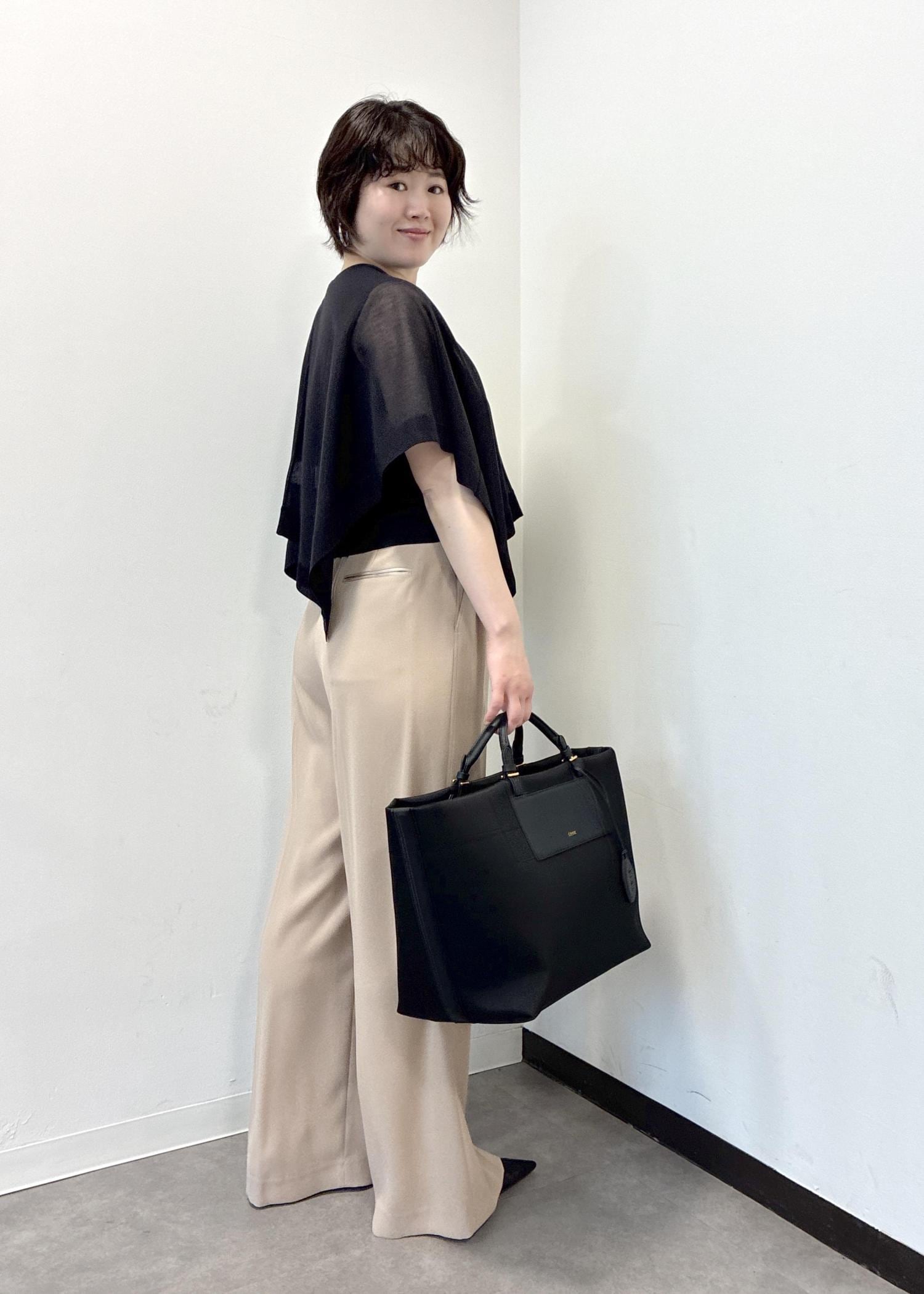 落ち感のある素材ですので、ワイドパンツもすっきり見えするシルエットです。