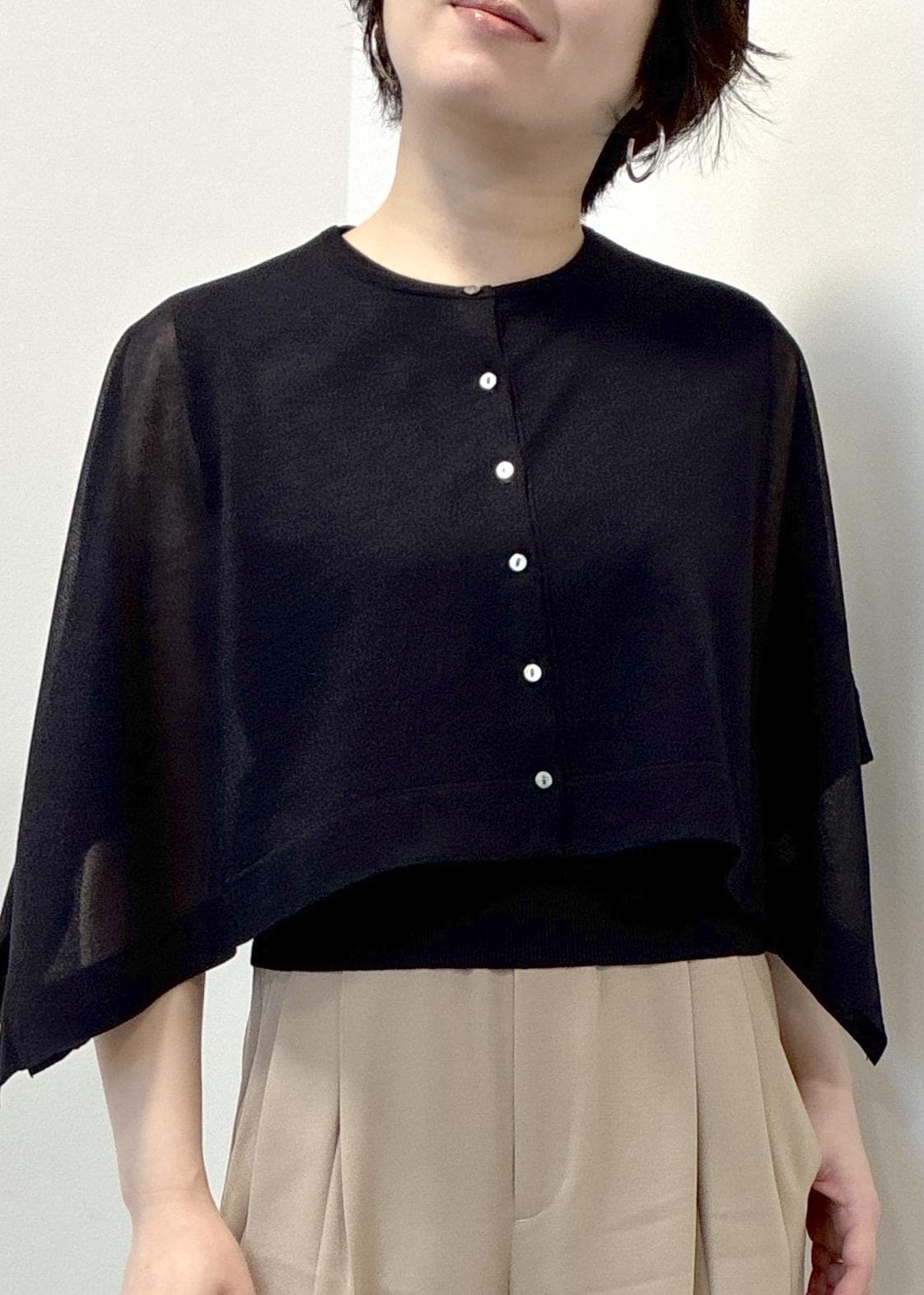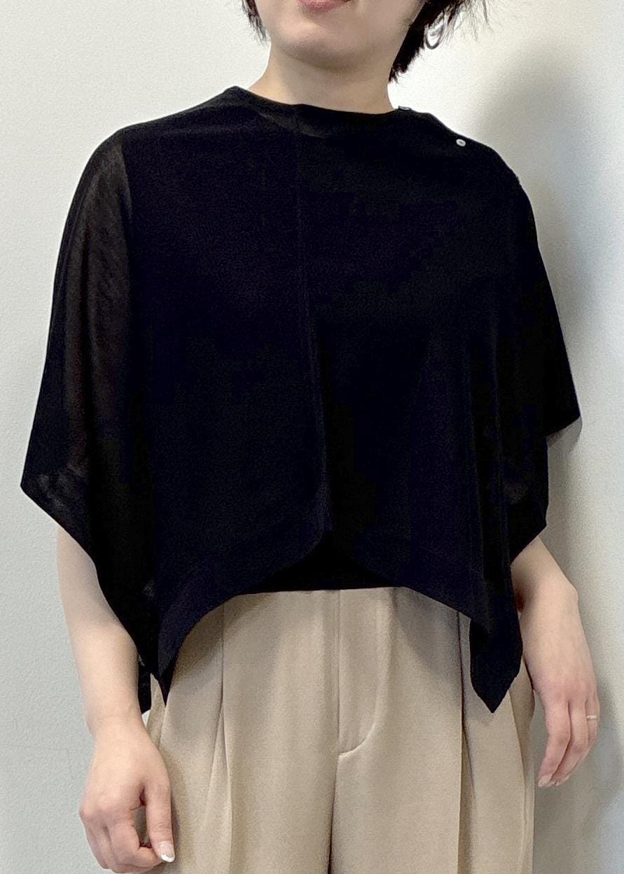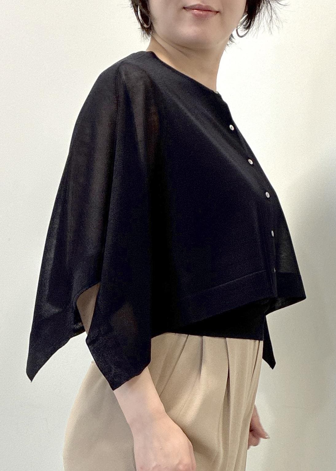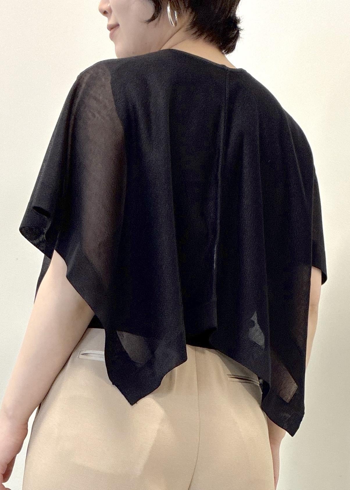 涼しく華やかな素材のショートケープと
