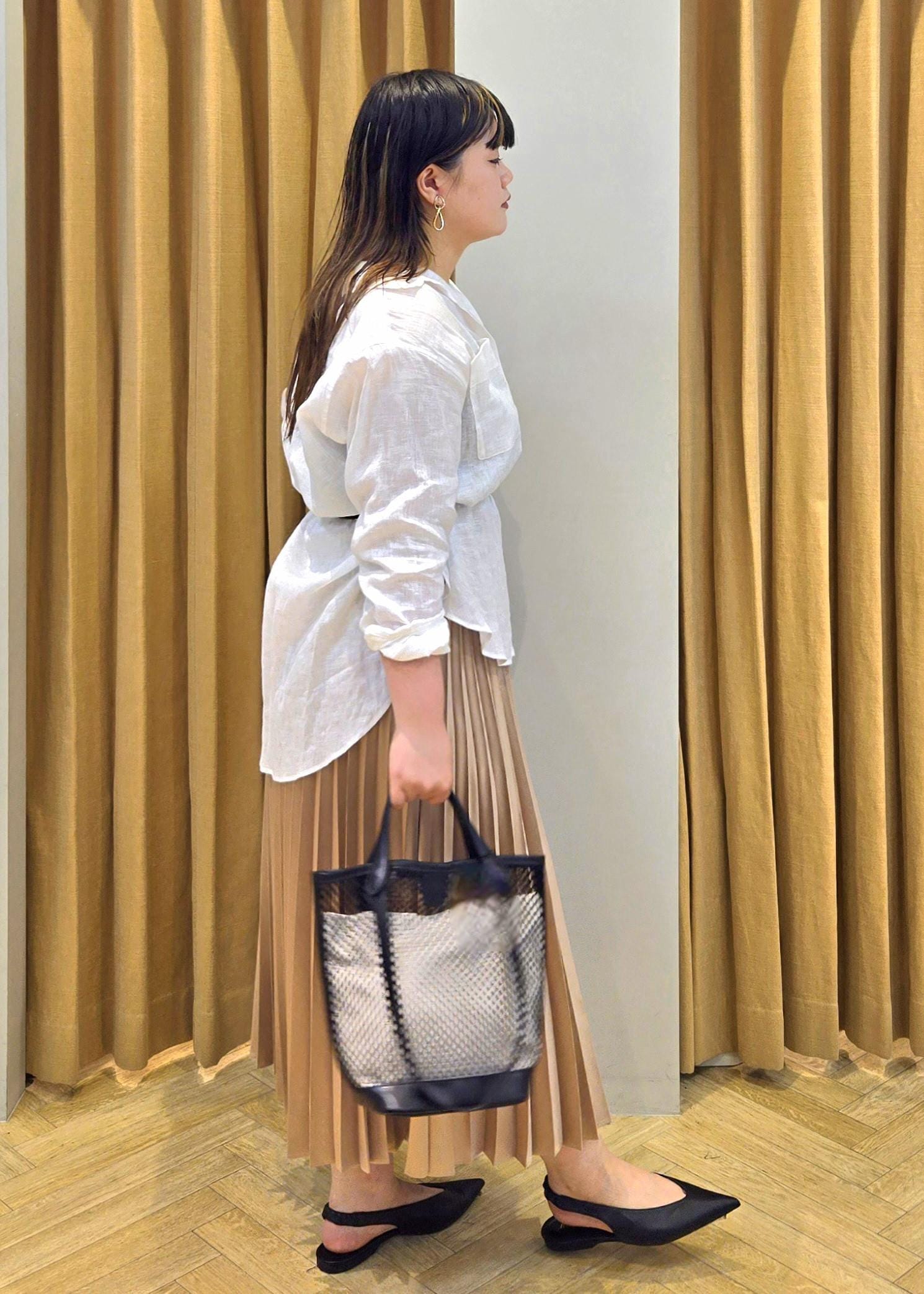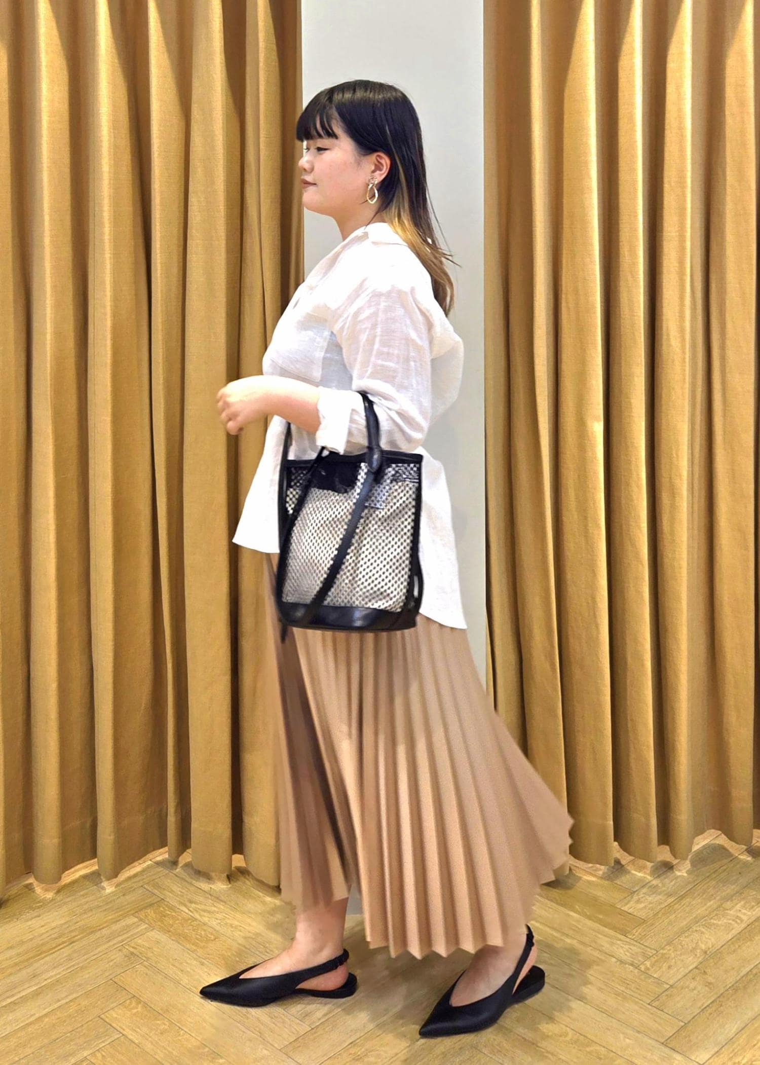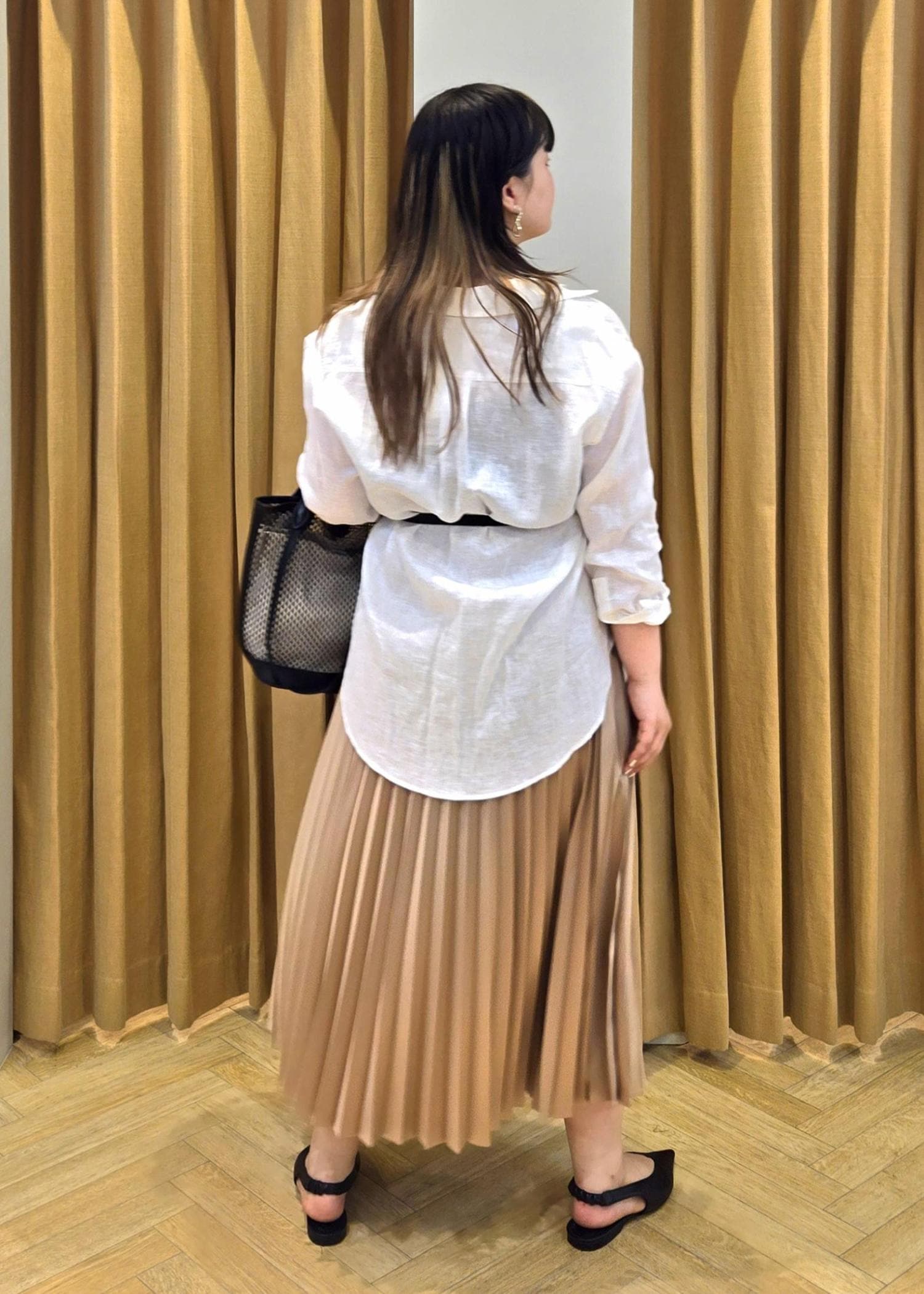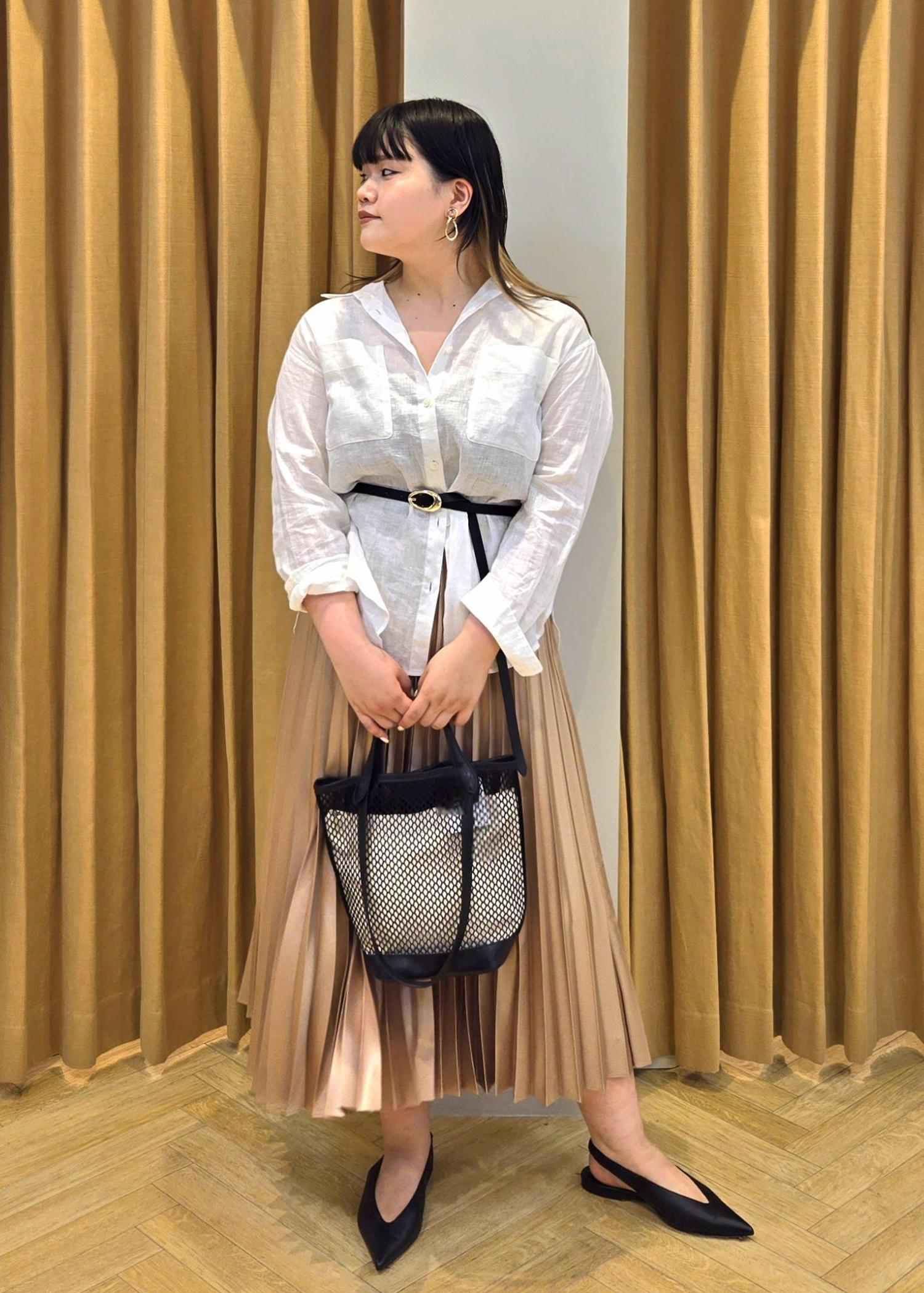 スカートは艶感が華やかな印象にまとめてくれ、ベルトを巻いてメリハリのあるコーデにしました。