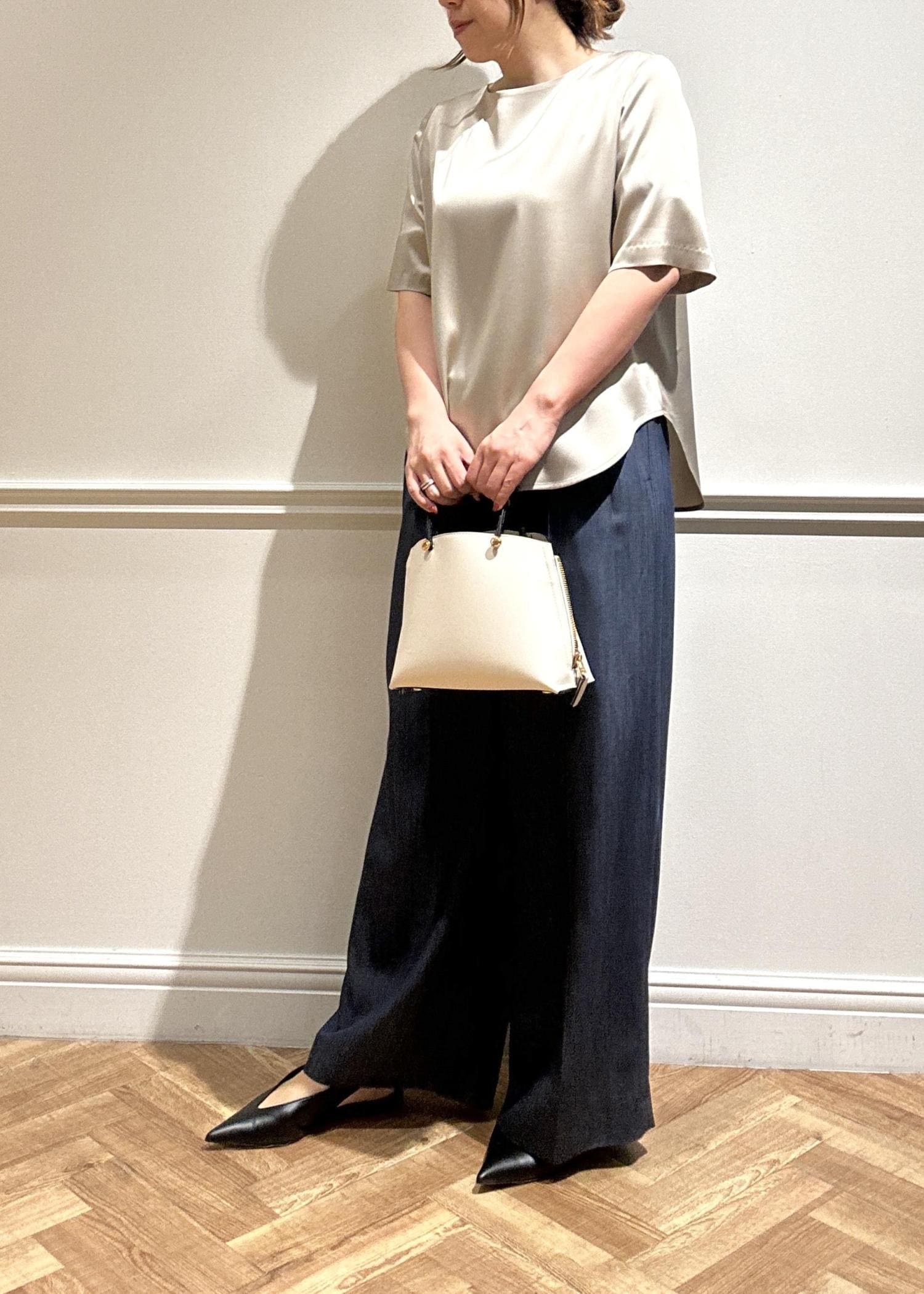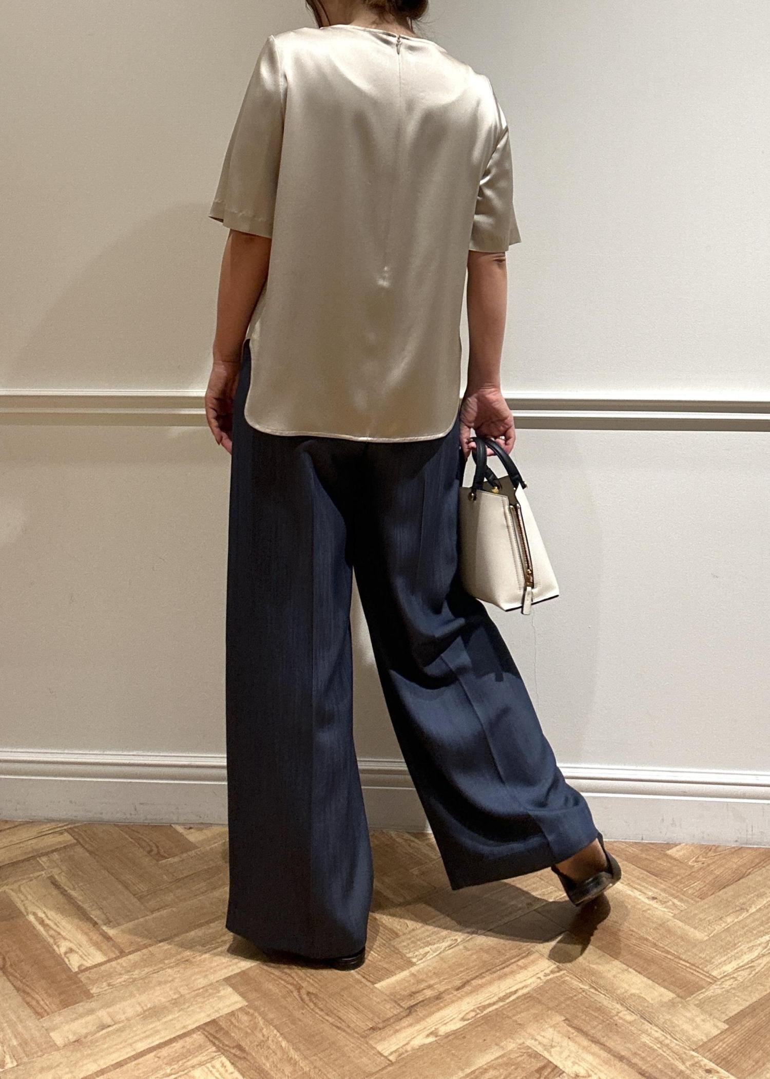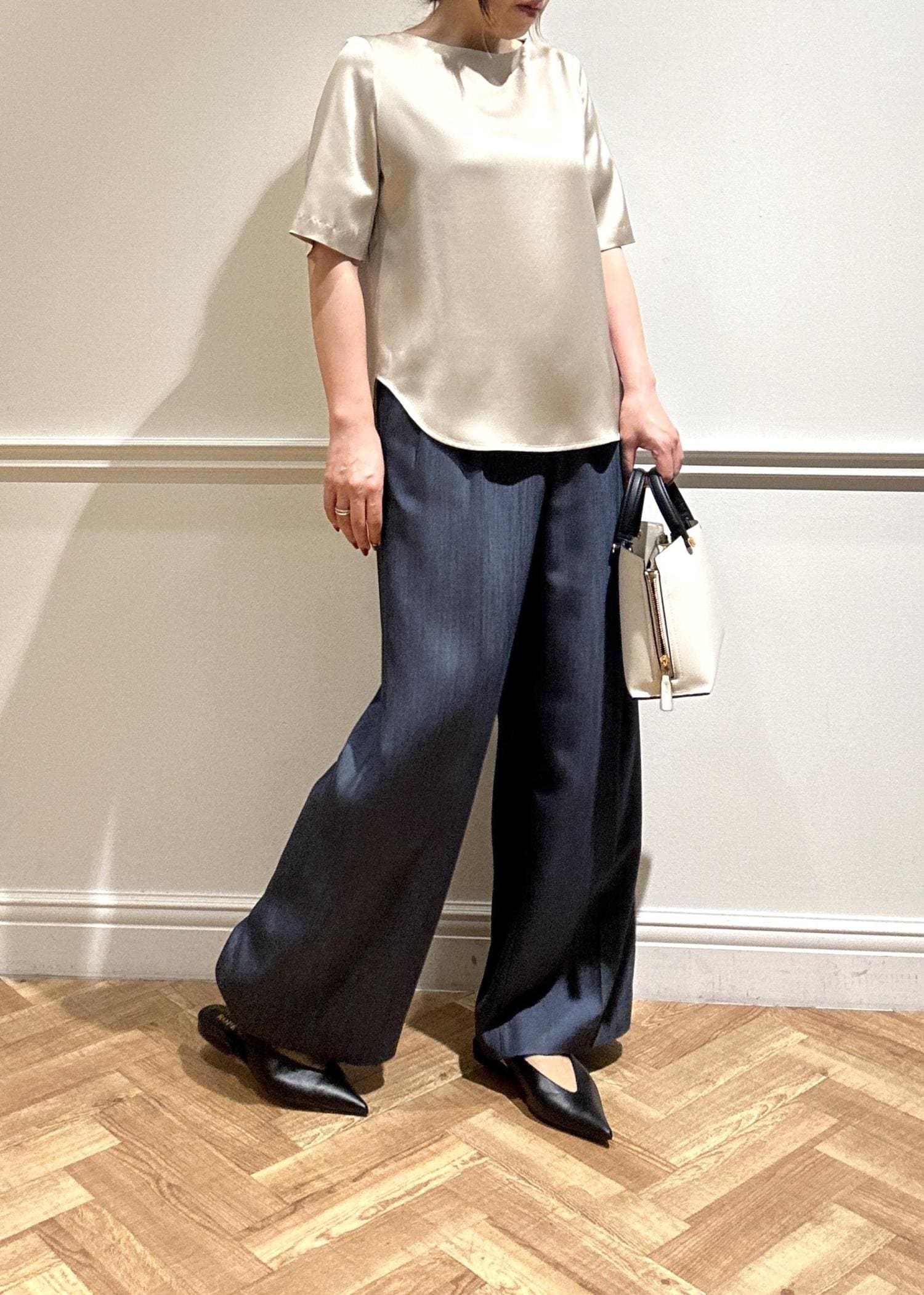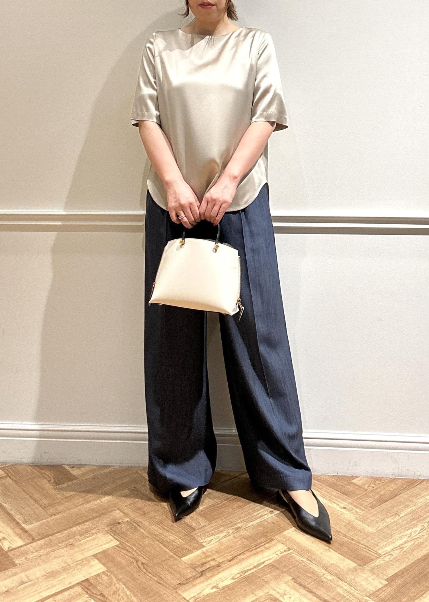 ベージュのサテンのトップスにワイドパンツで合わせてみました♪