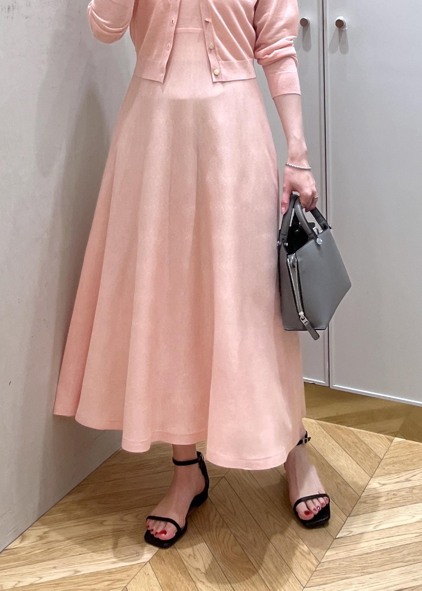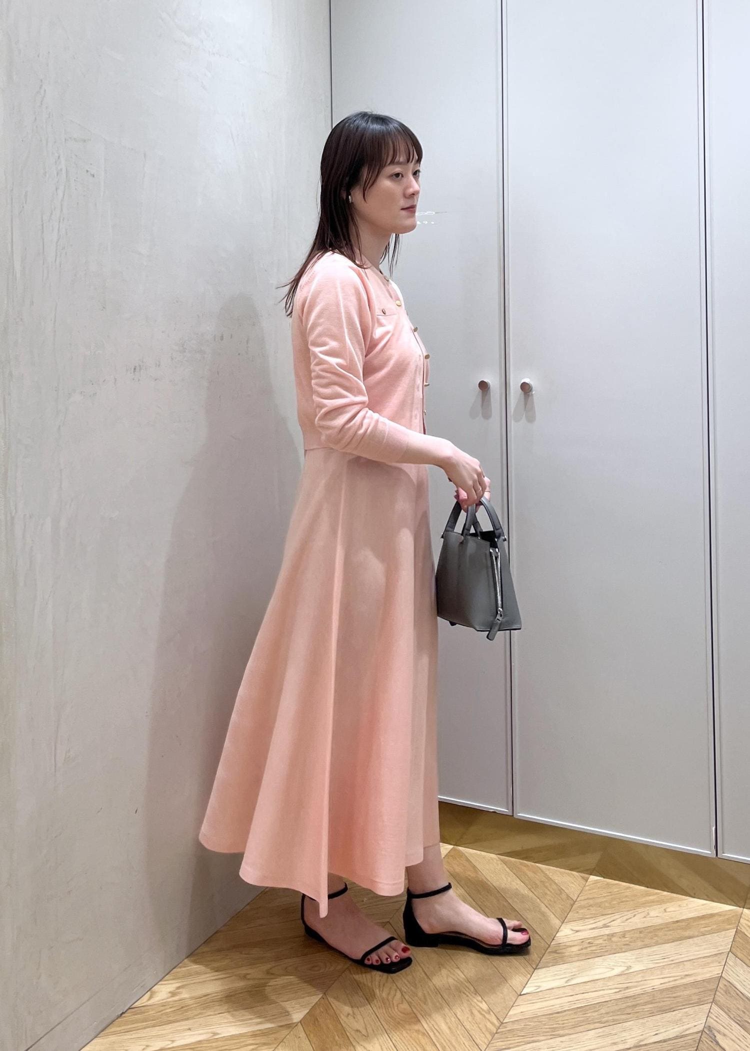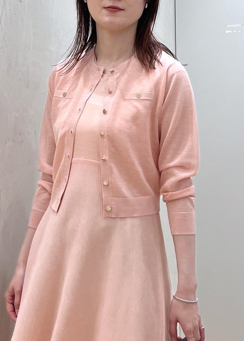 透明感のある馴染みの良いベビーピンクの、ワンピース、カーディガンの2型をラインアップ。