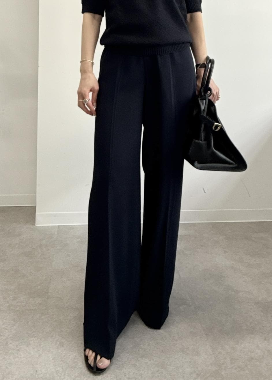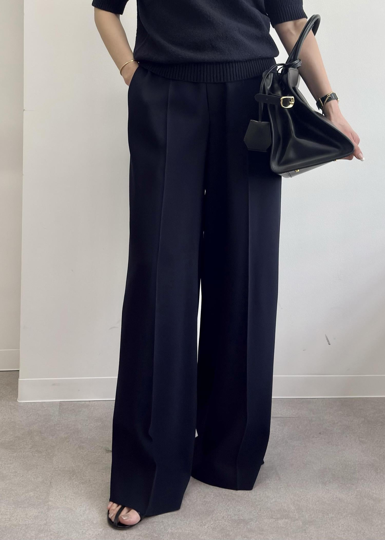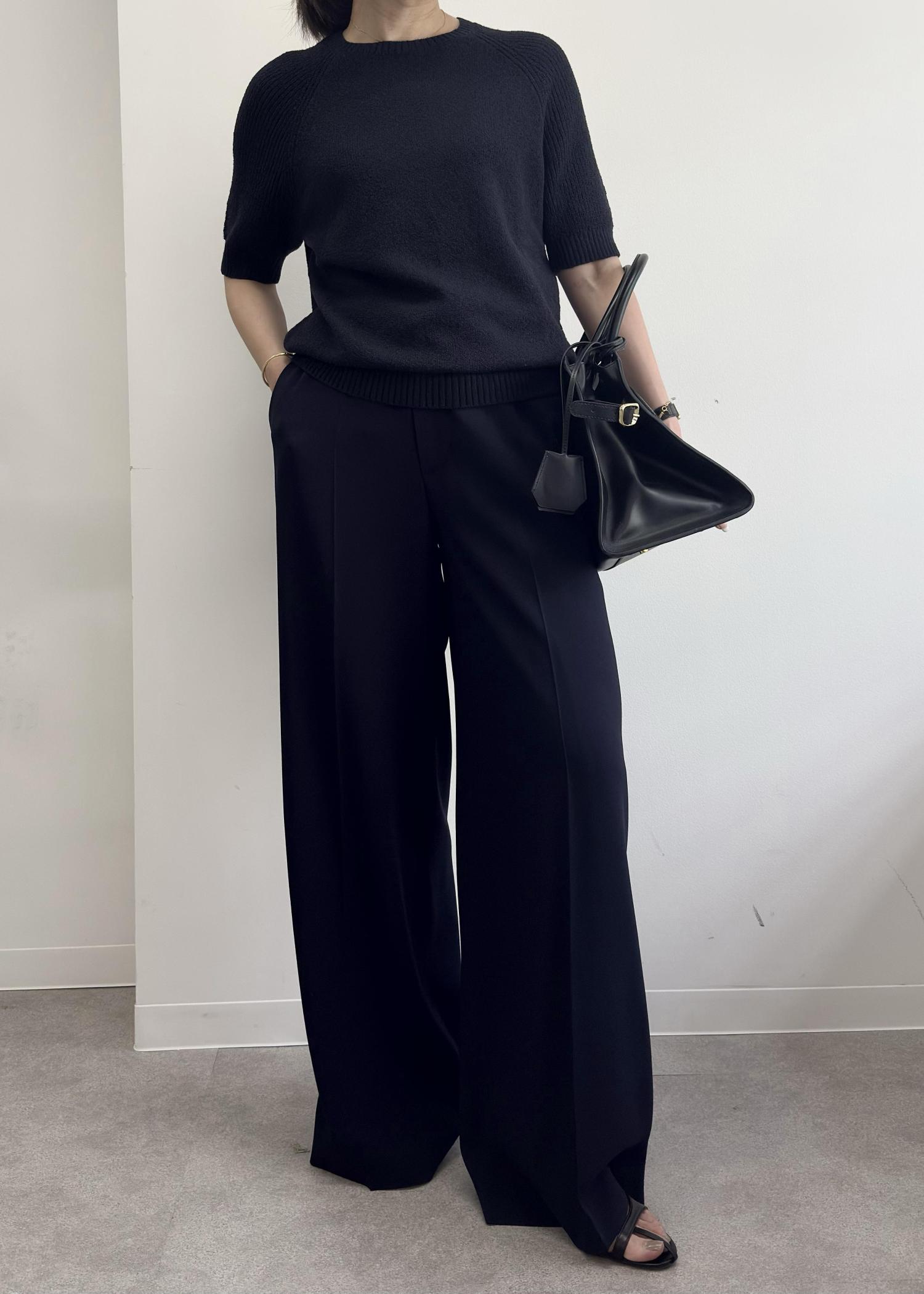 パンツはバックサテンのジョーゼットタイプなので非常に着心地よくシワも気になりにくいのが特徴。体のラインをカーヴィに見せてくれるので153cmでもバランスよいパンツシルエットになります。