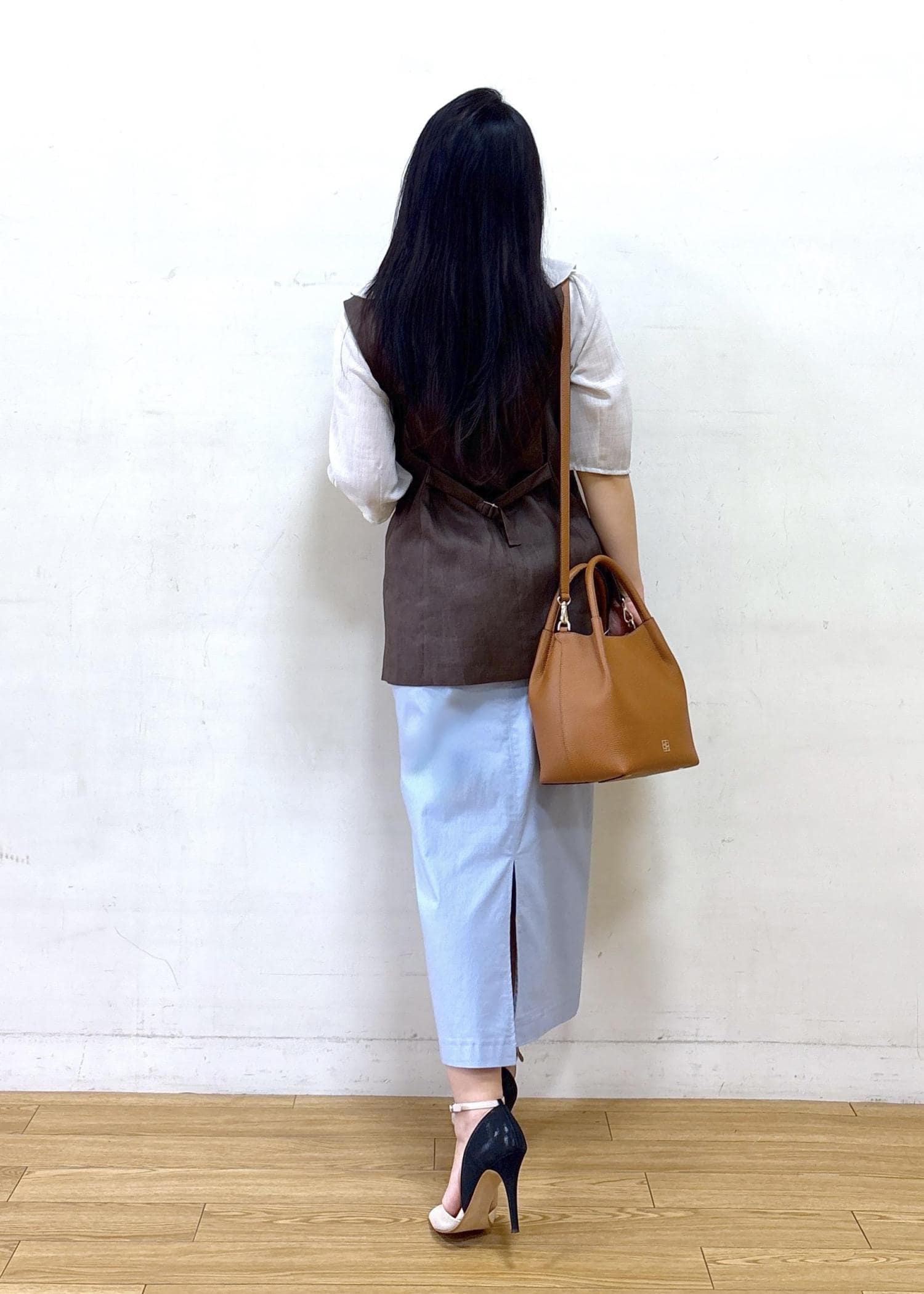 ウエストは少しシェイルされていて、後ろのアジャストベルトで調節でき女性らしいシルエットになります。