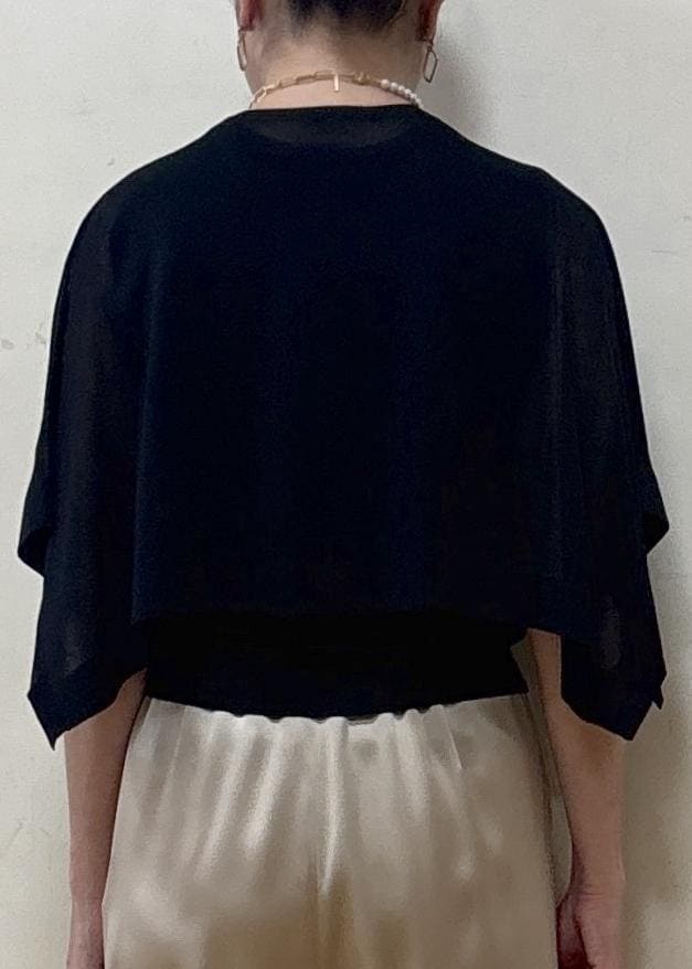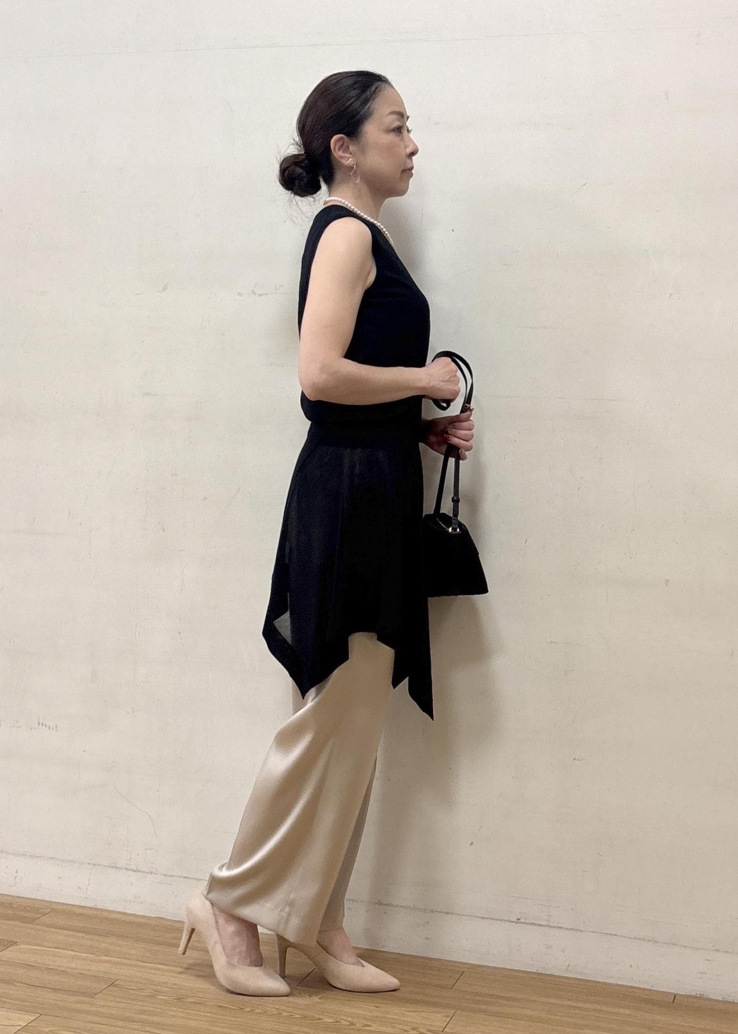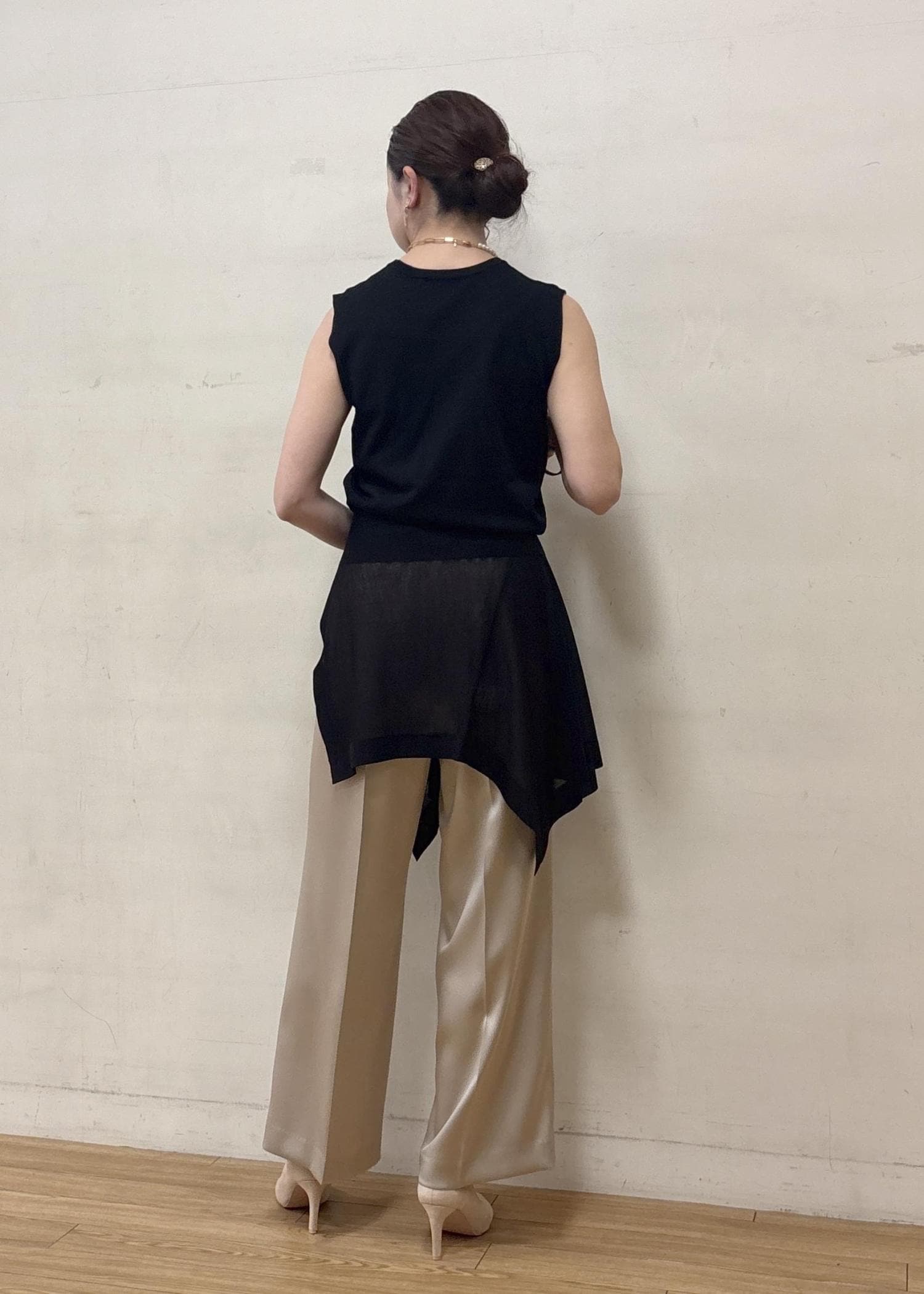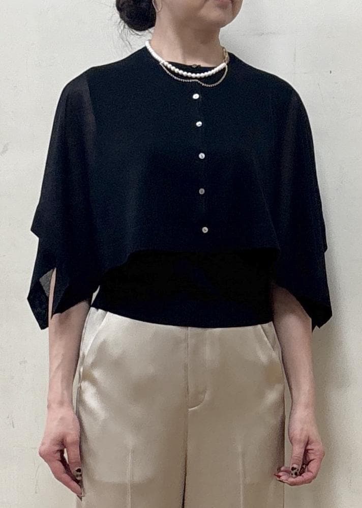 ノースリーブのプルオーバーとケープのアンサンブル。着丈は腰にかかるくらいの丈感ですっきりとしていて、インせずきれいにお召しいただけます。