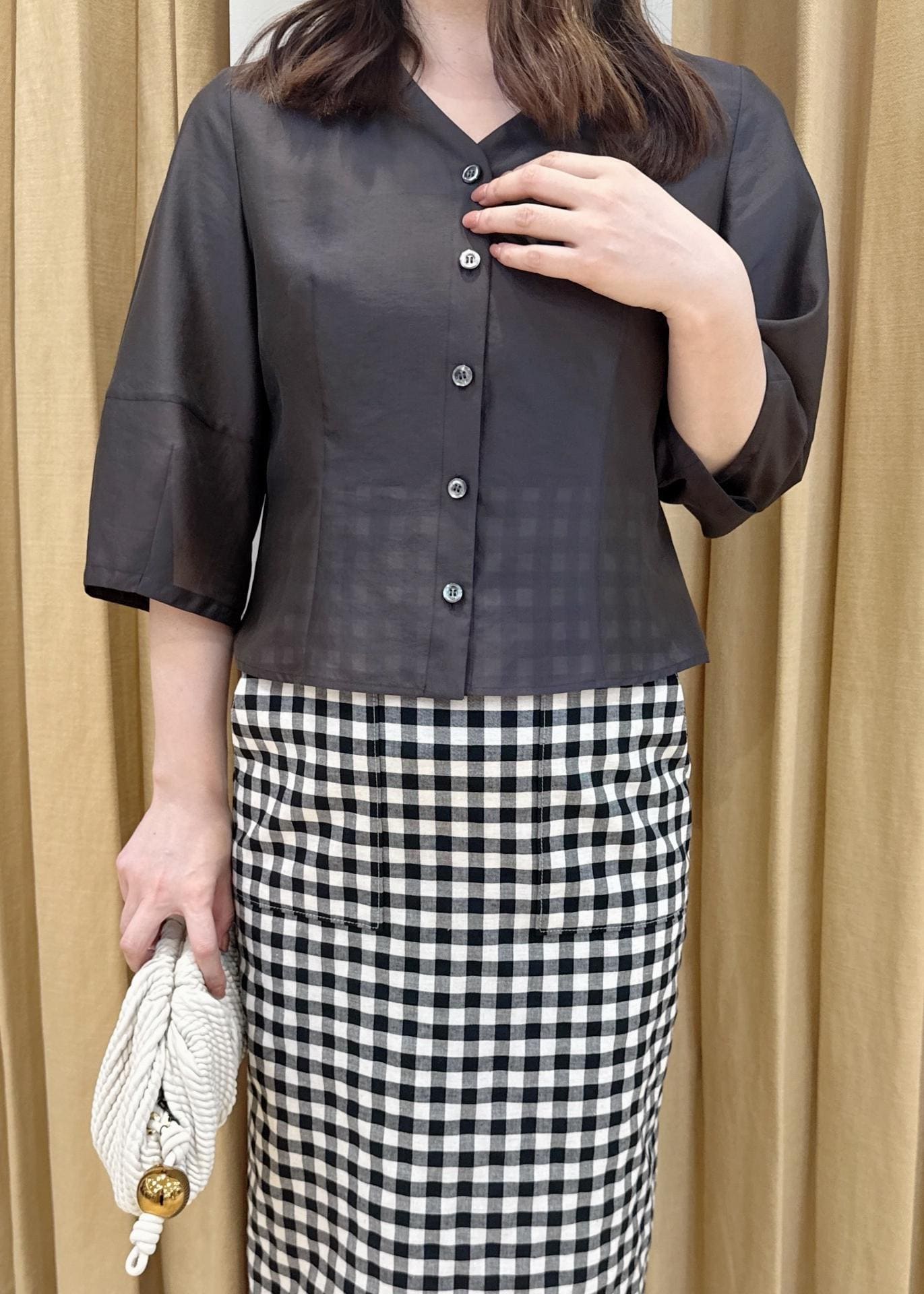 透け感と艶があるので重たく見えず、袖の切り替えがふくらんで華やかな印象にしてくれます。