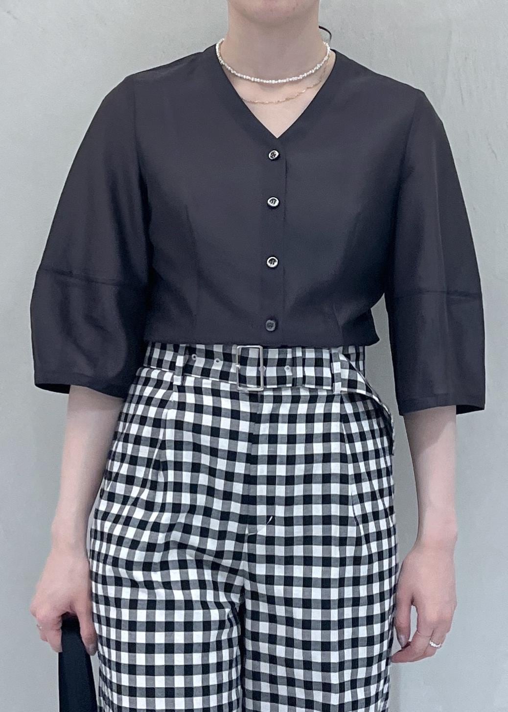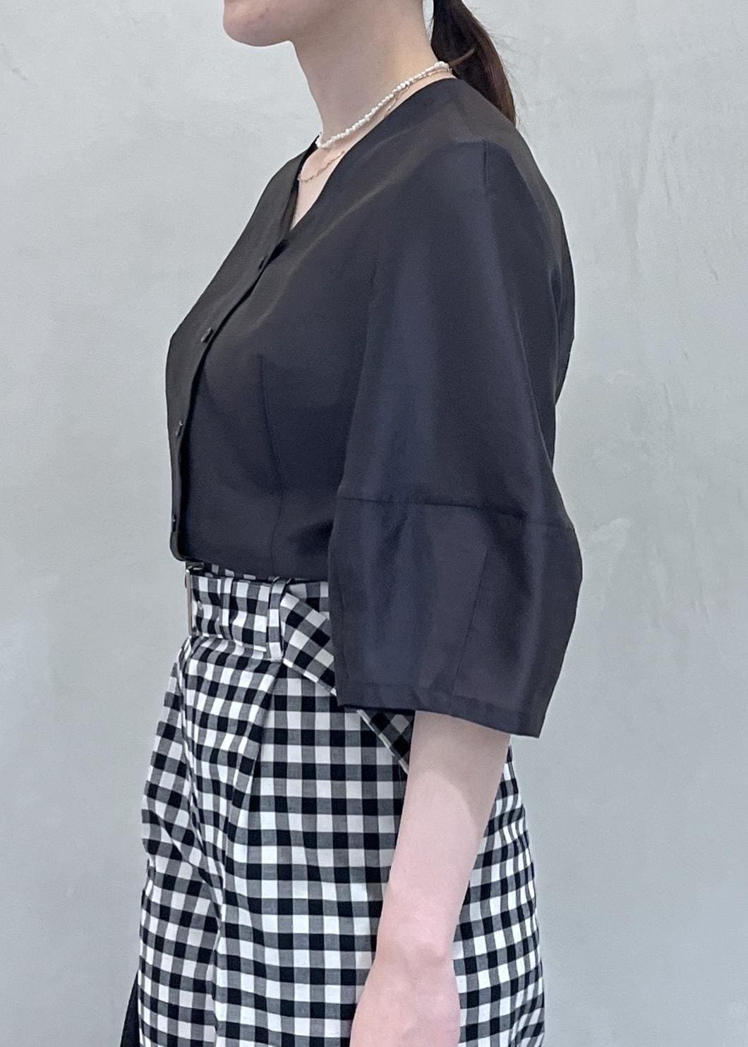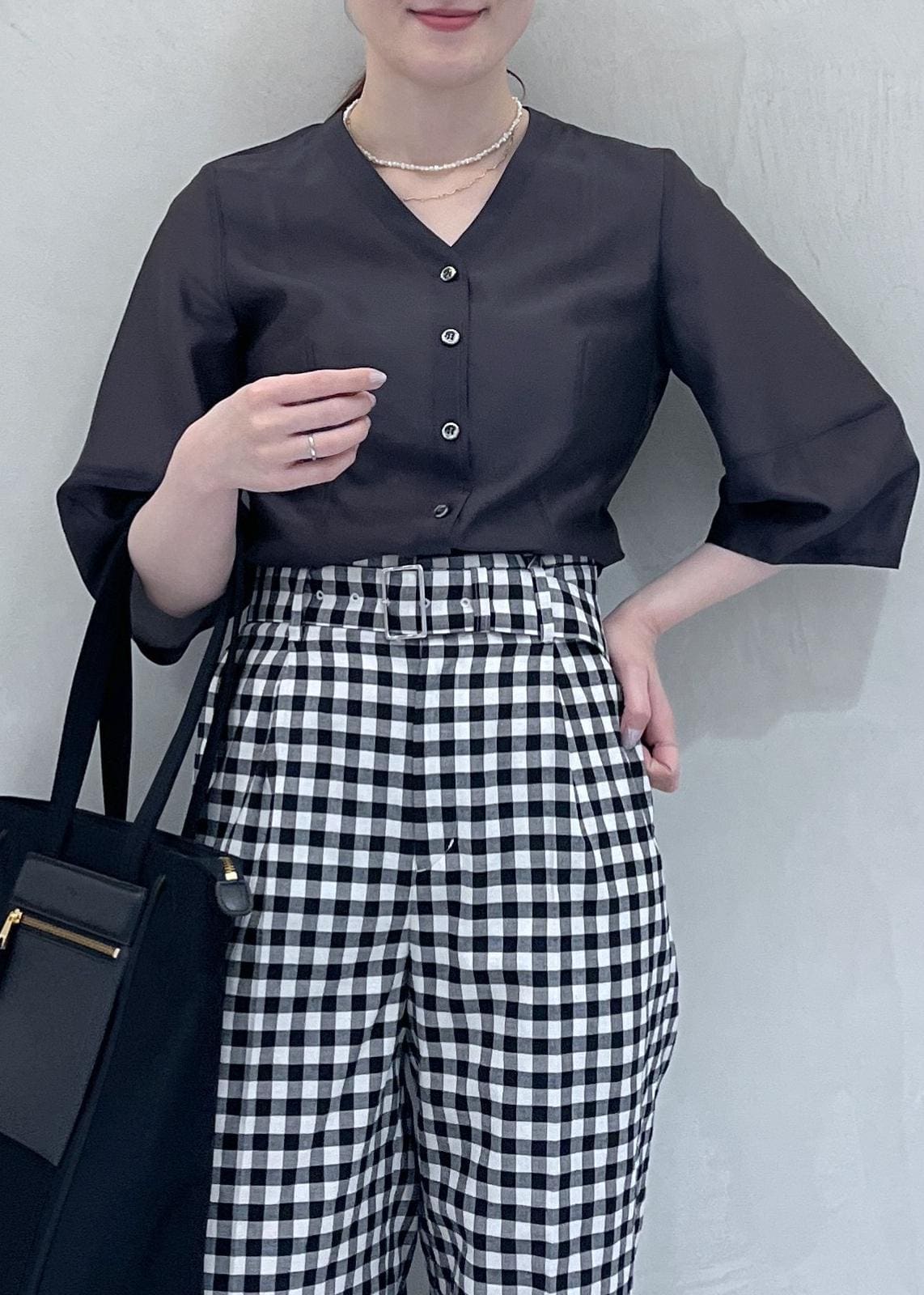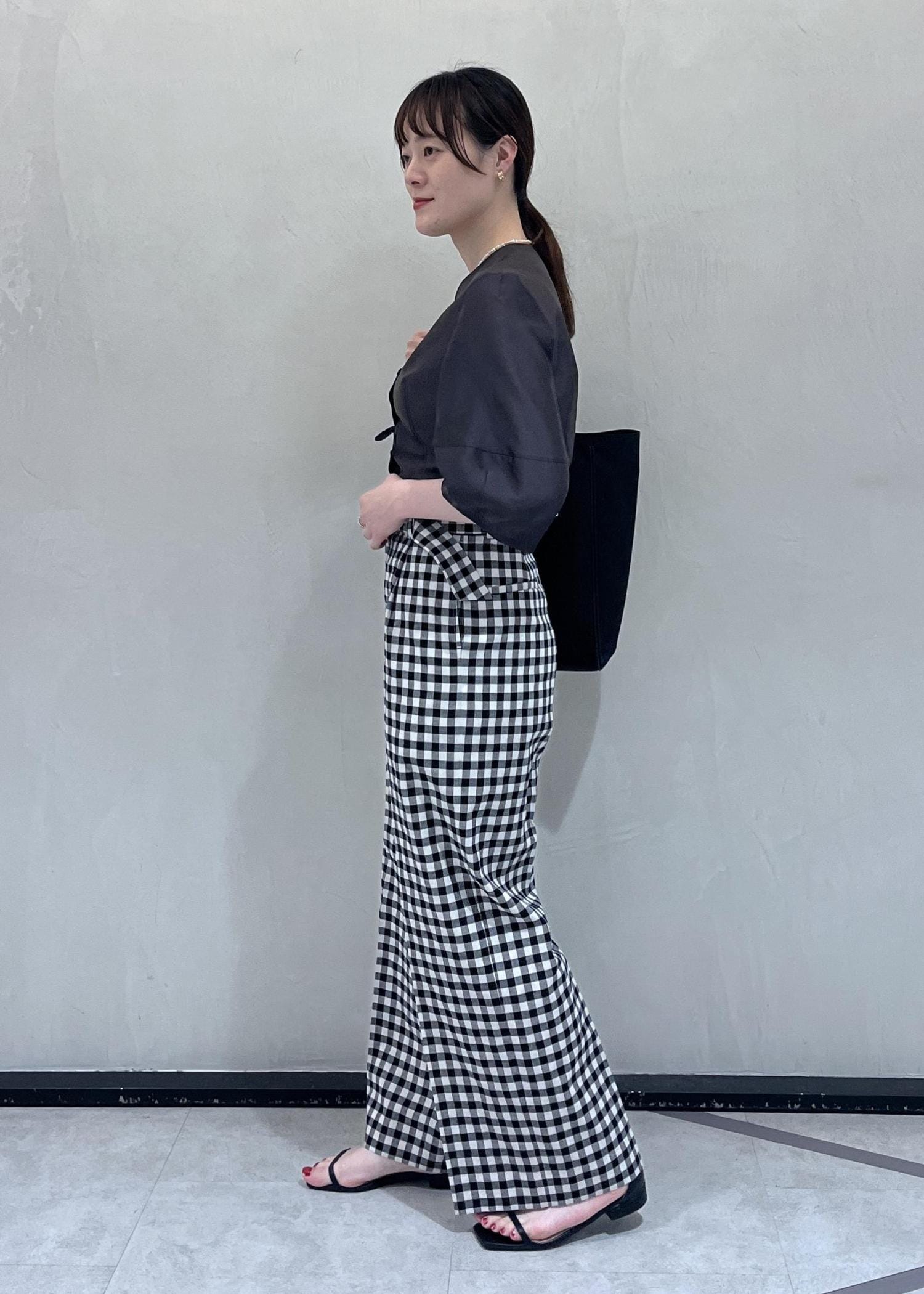夏のブラックスタイルも涼しく、季節感を感じるスタイリングにしたかったので、ギンガムチェックを取り入れました。