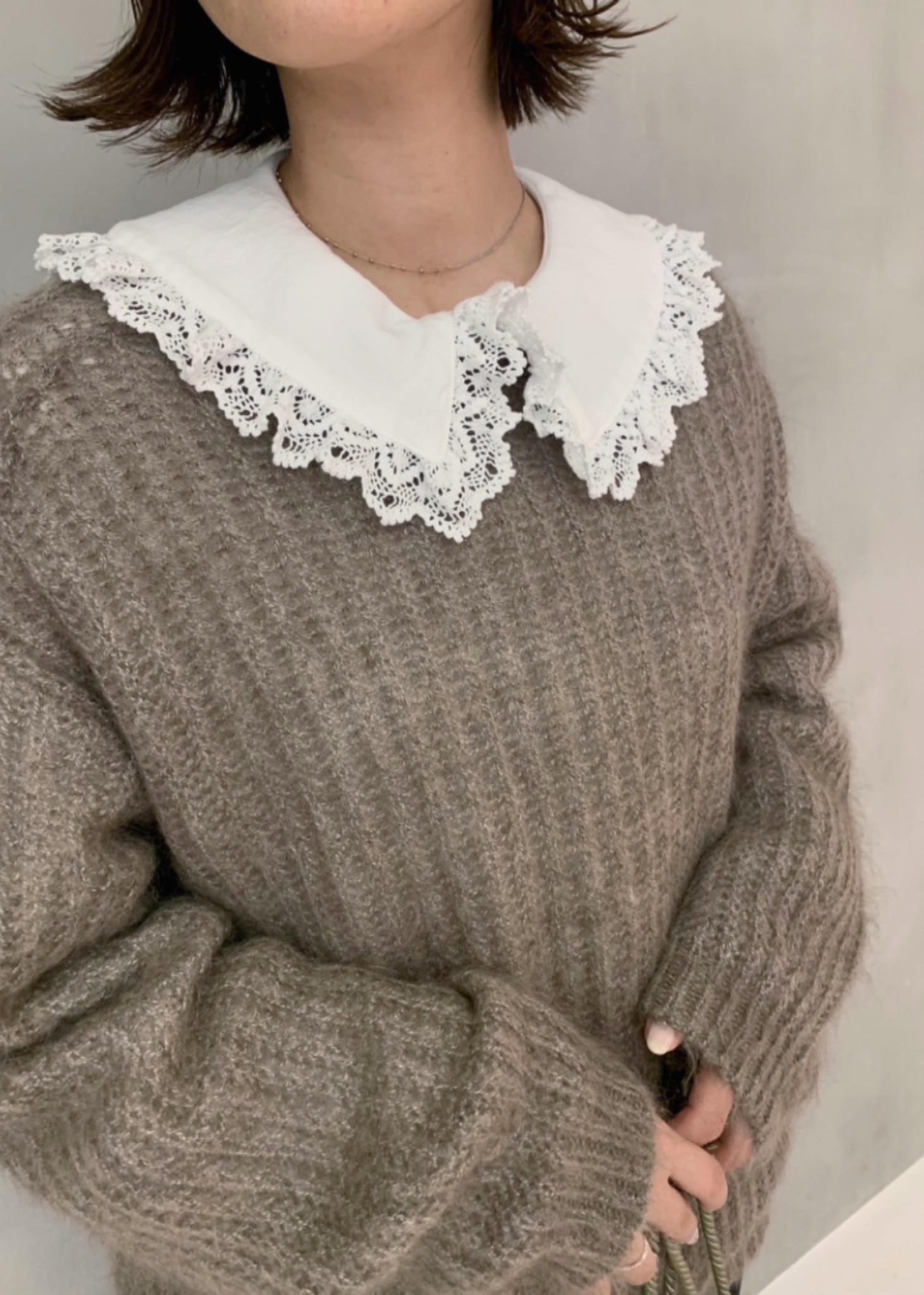 モヘヤ素材の着心地抜群なニットに大きめのレース襟が可愛いブラウスをレイヤードし、甘すぎなくする為にブラックデニムを合わせてみました♪