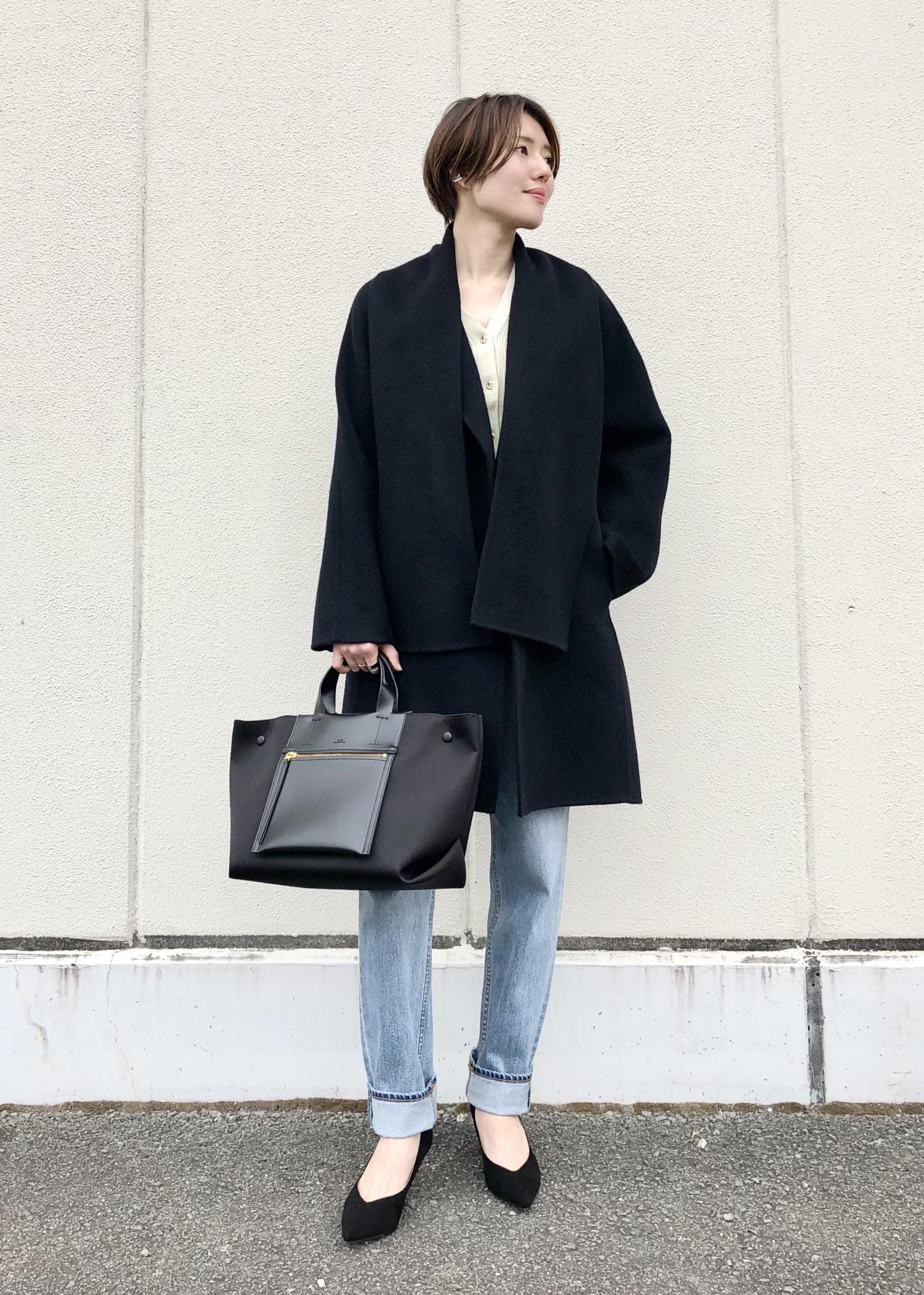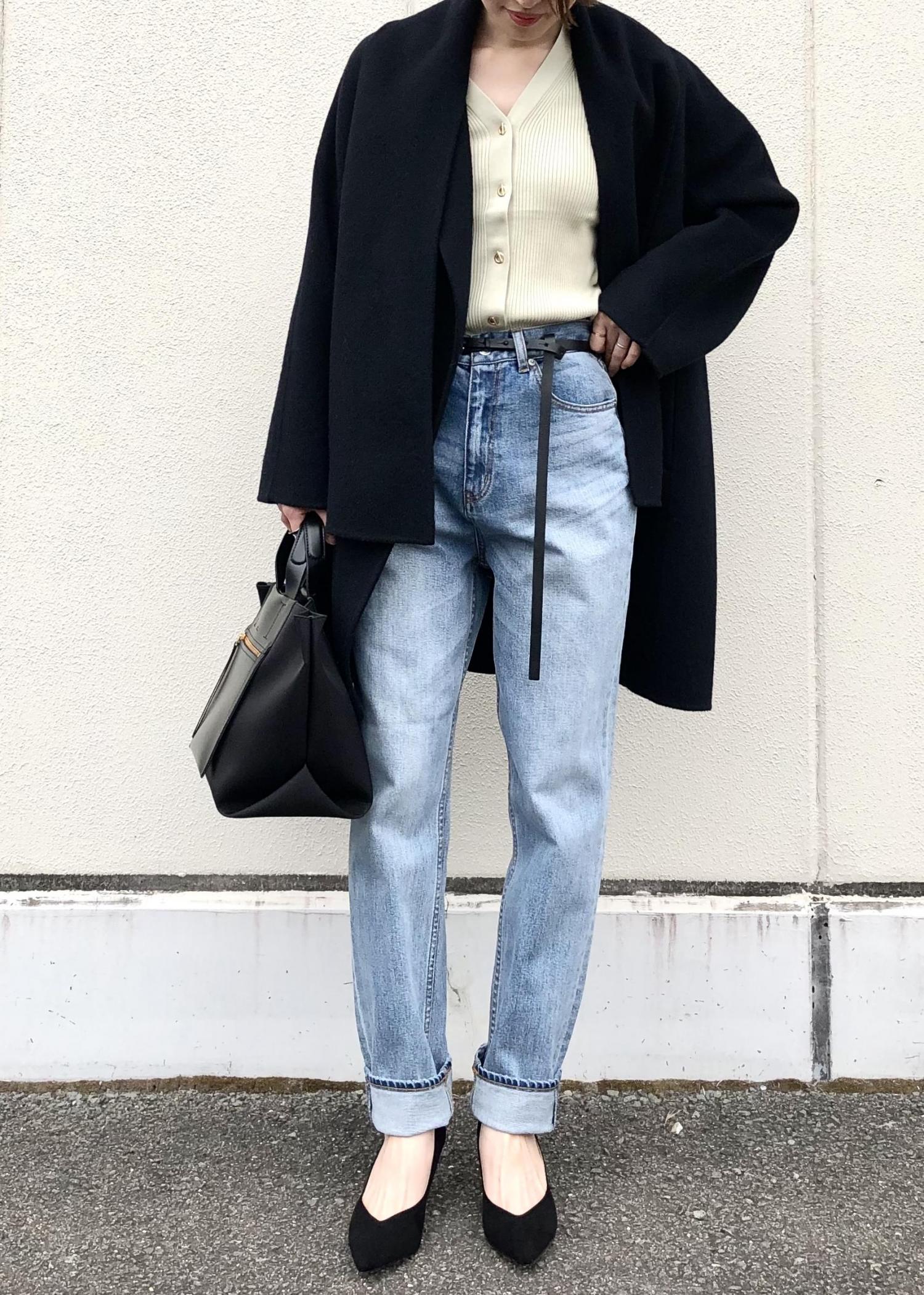 カジュアルになりがちなデニムをブラックアイテムと合わせて、どなたでも取り入れやすい大人カジュアルなスタイリングにしました♪