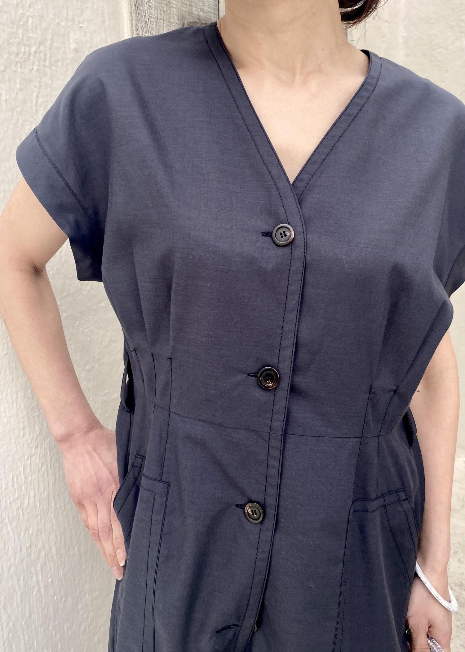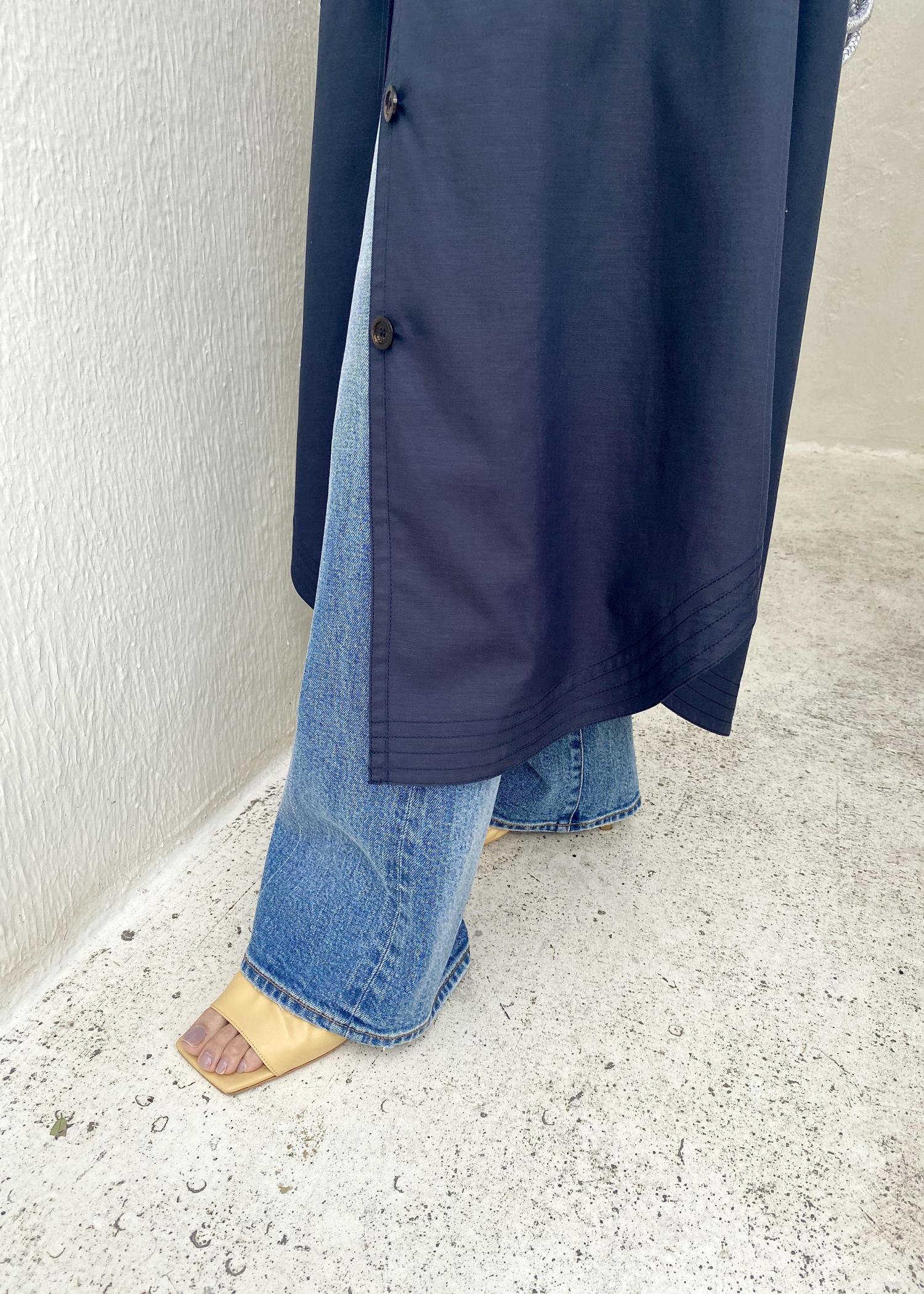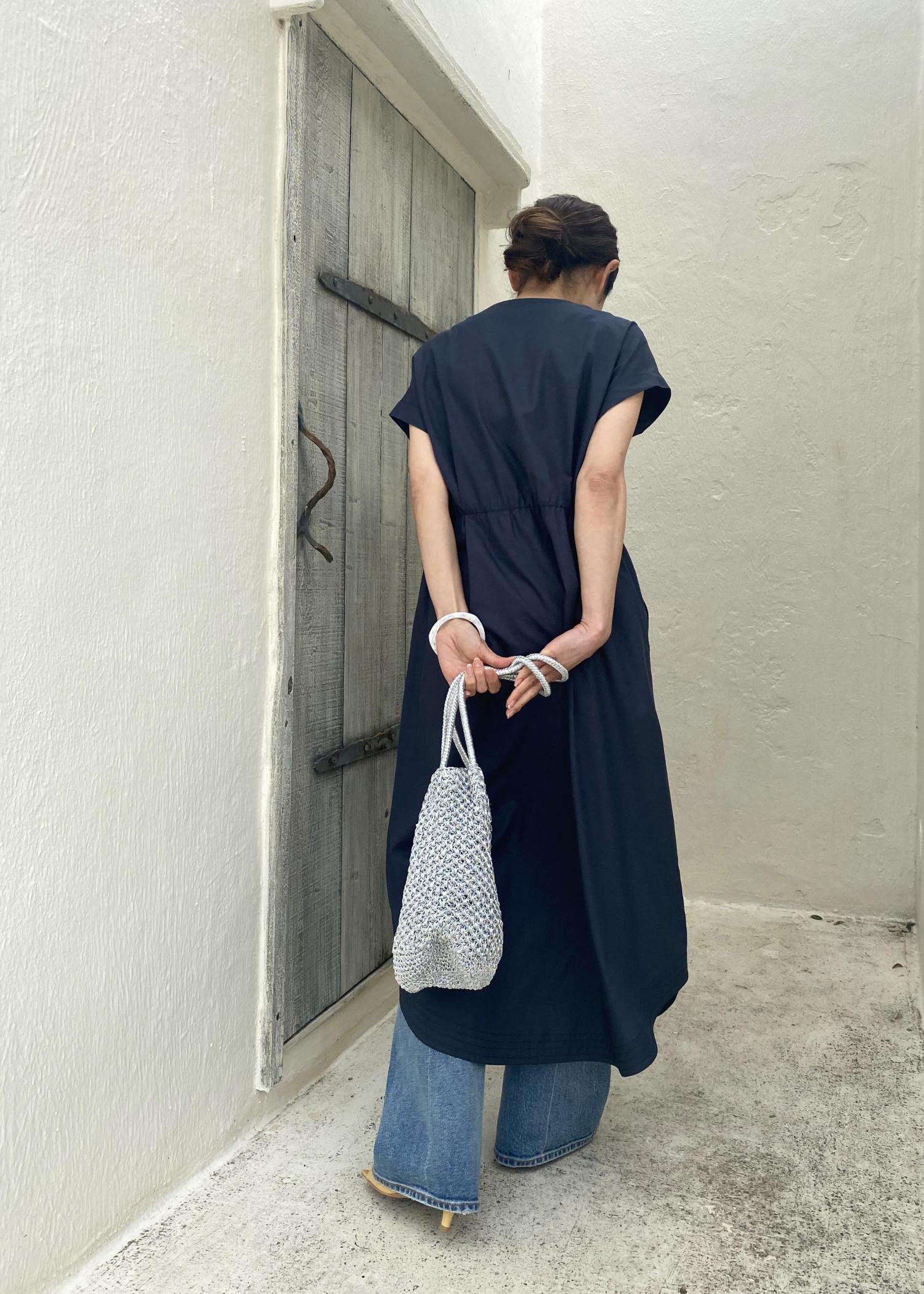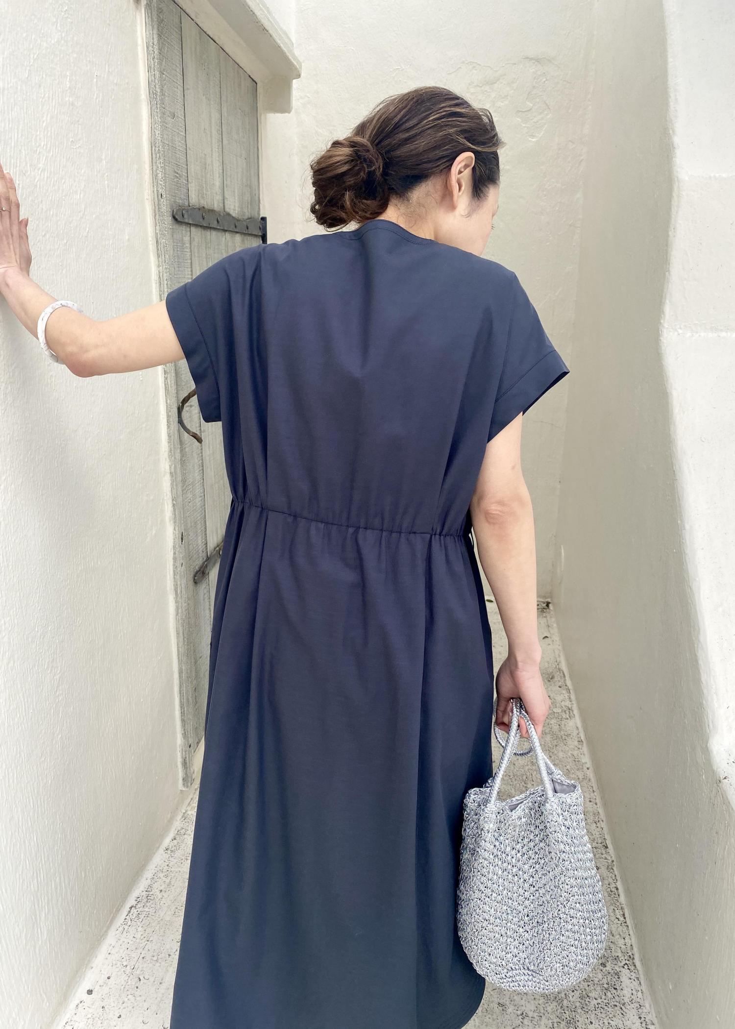 1枚でラクチンなワンピースですが、デニムとレイヤードすることで違う印象に。今年は羽織としても◎フロント釦は止めてコーデしましたが、全て開けても可愛いです!