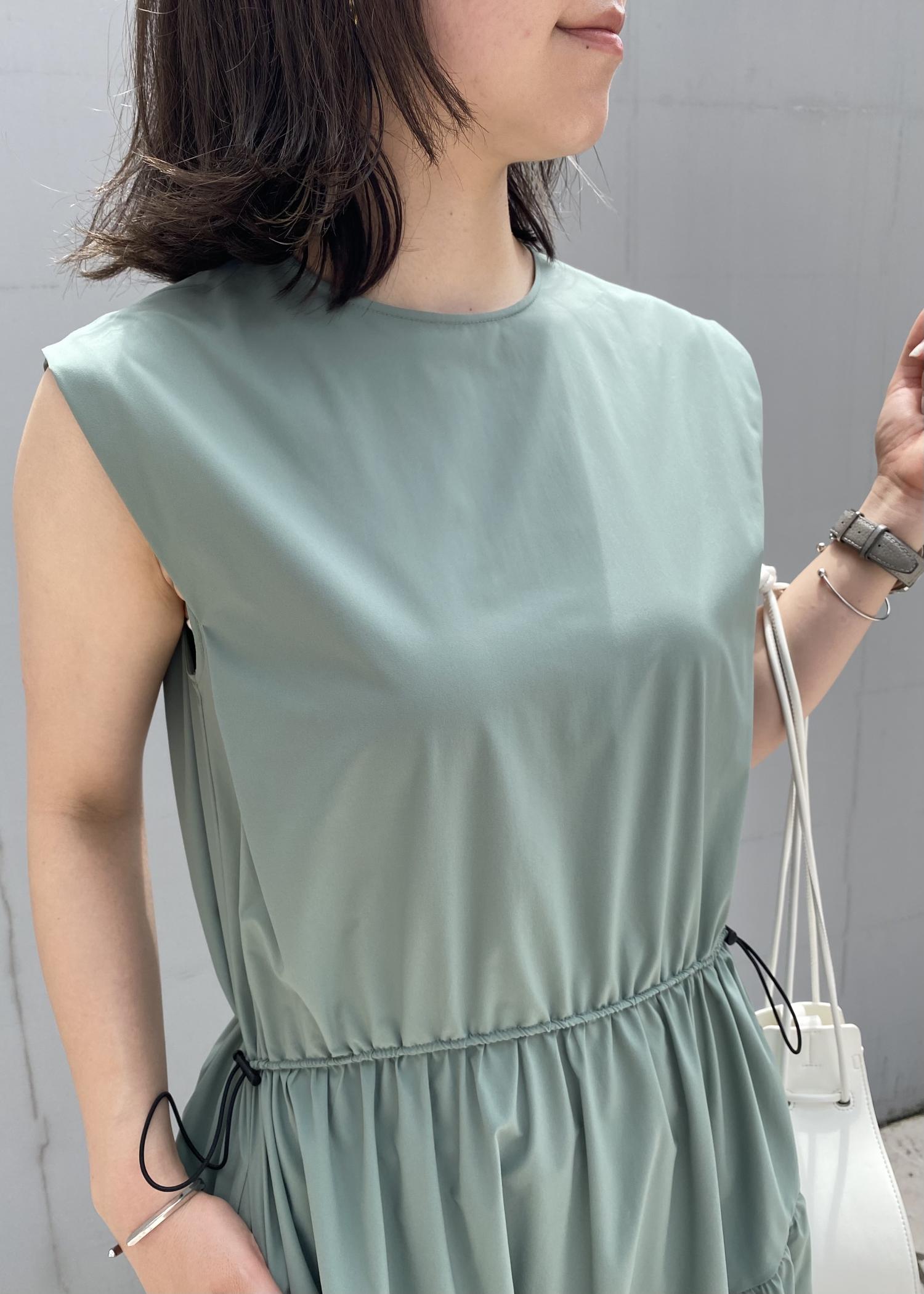 カラーは今年らしいくすみ系のカーキで、普通のカーキよりもブルーが強いので一枚で着るだけで華やかに夏らしく着られます。