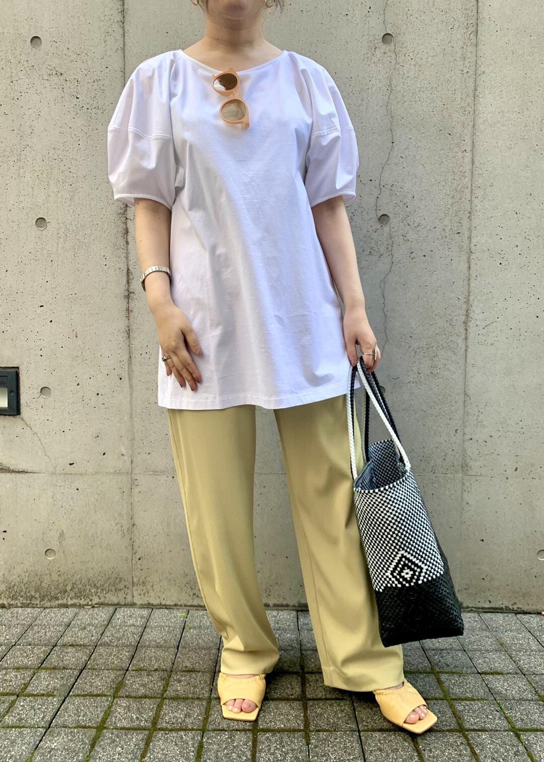 今回は袖フォルムのチュニックにリブ風の素材感のリラックスパンツを合わせてみました。