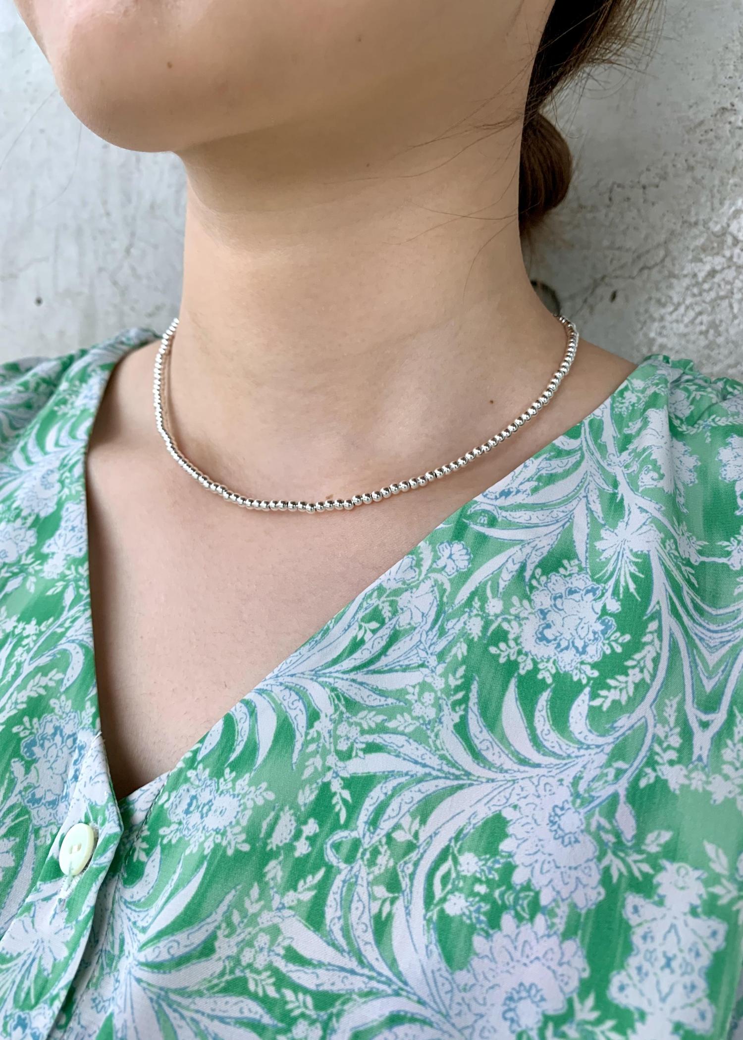 【素材感】シルバーのメタルビーズ製で素肌に着けると少しひんやり感じます。メタルのキラッとした素材感はコーディネートにアクセントになります。