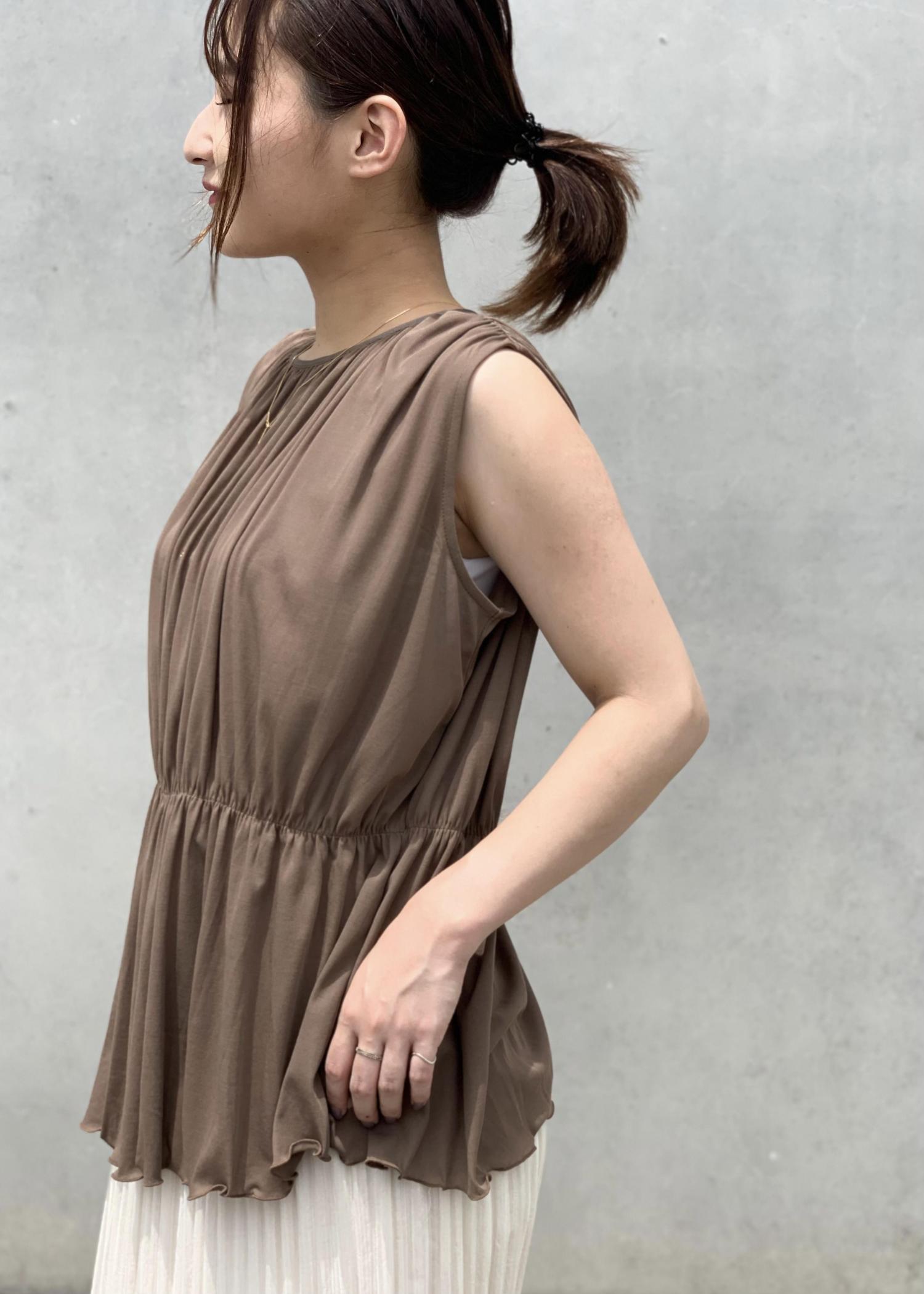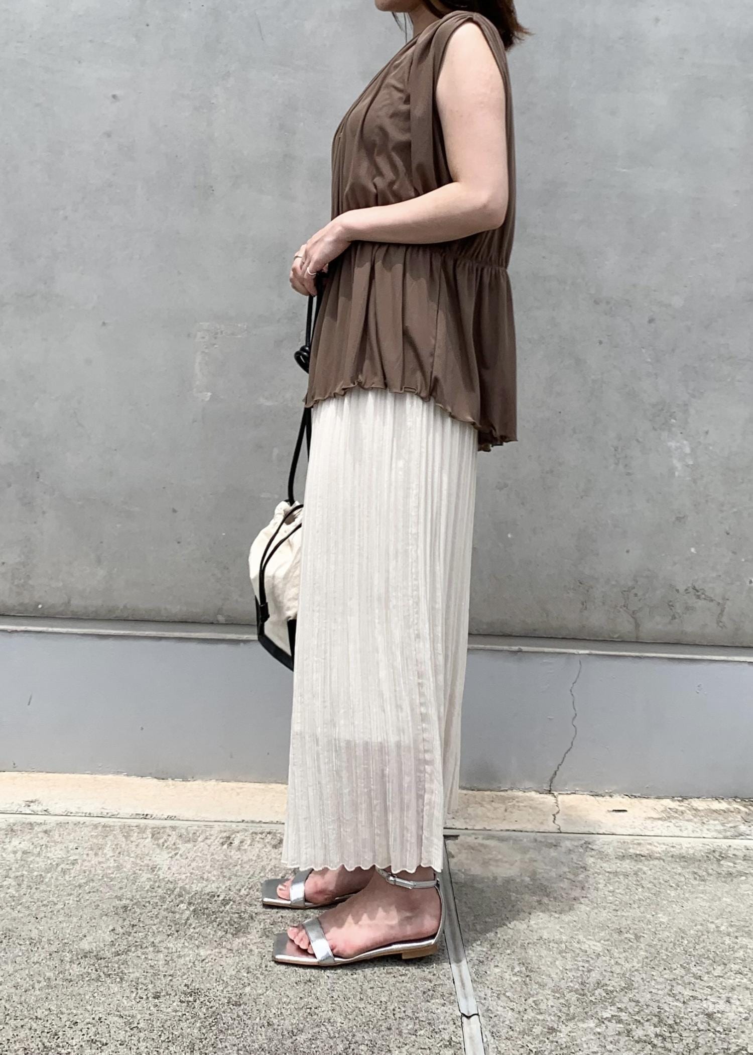 ギャザーカットソーはウエストがペプラムデザインなので、プリーツスカートと合わせた時にもメリハリがついてバランス良く着こなして頂けます。