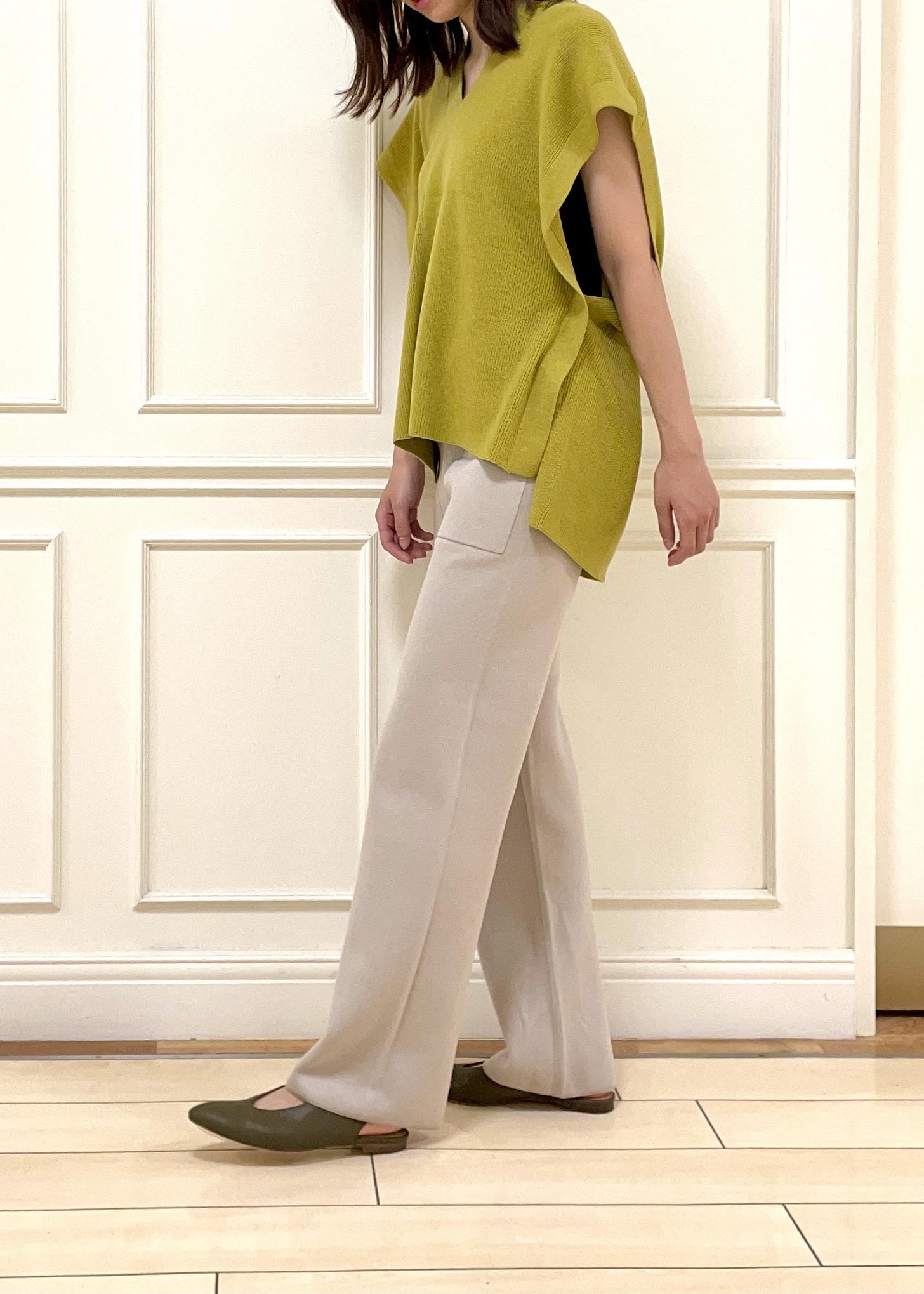 カジュアルなコーディネートですが、ワイドパンツから覗くVカットで足元はきちんと感を演出。