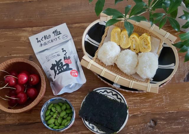 忙しくてしっかり作れないバタバタの朝。 うま塩入りの卵焼きと、昨日の残りの枝豆に炒りごまとうま塩をひとつまみぱらり。 それに息子が握ってくれたいびつな塩結びでかんたん朝食。 うま塩には干椎茸、昆布、干帆立の天然の旨味成分が凝縮されているので、調味料はこれ一つで素材の味をぐっと引き立ててくれます。 あまり白ごはんが好きではなかった息子ですが、このお塩を使ったおにぎりを食べてからはお腹が空くと「塩おにぎ作っていいー?」と言うように。