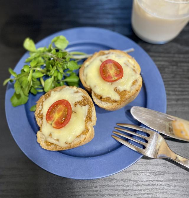 私は、バケットにエゴマスタードを塗りチーズとミニトマトを乗せてトースターで焼きました。