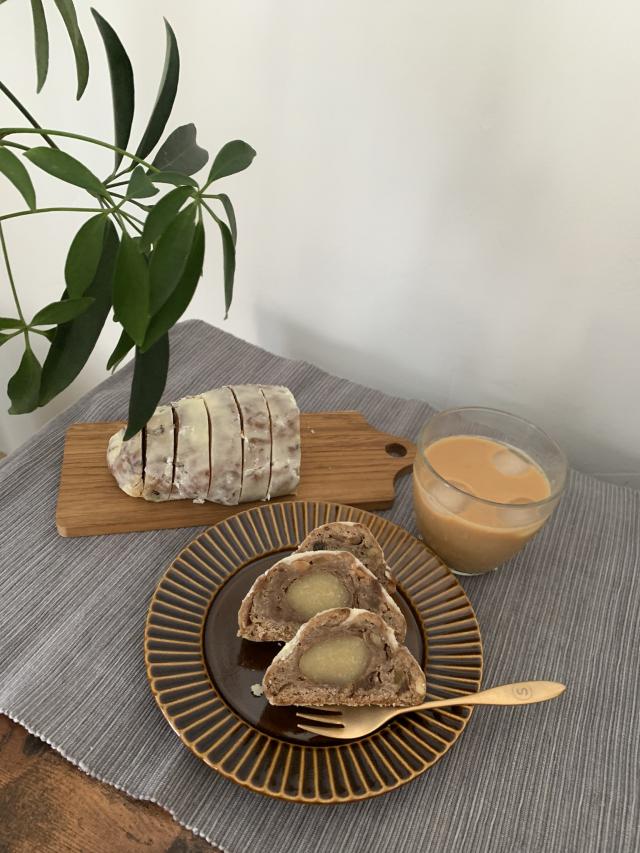 シュトーレンは華やかな ラッピングペーパーで販売しております。 柔らかくドライフルーツやマロンがぎっしりで 食べ応えありです。