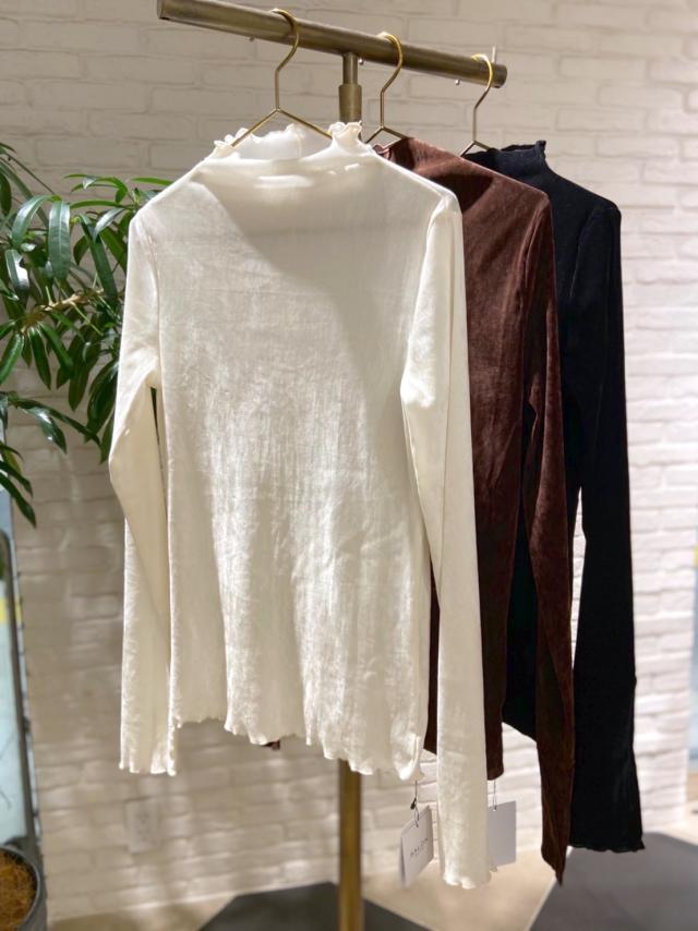 シースルー感がありつつも素材はベロアで秋冬らしさとおしゃれ感UPなボトルネックプルオーバー。