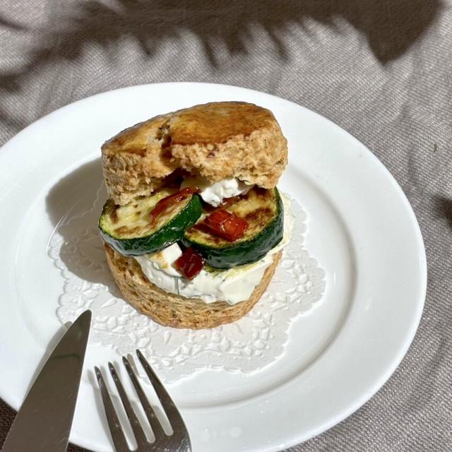 季節限定オレガノスコーンに、こんがり焼き目を付けた歯ごたえのあるズッキーニとアンチョビハーブチーズクリームをサンド。