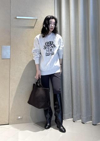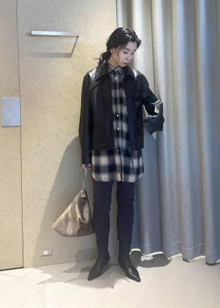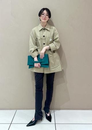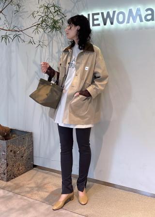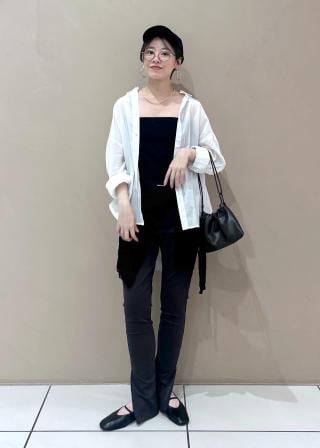 やや長めのトップスと細いボトムを合わせるスタイリングで、