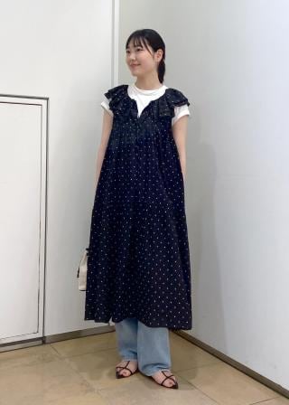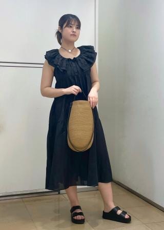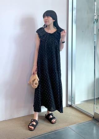 ネックをラッフルで飾った別注ノースリーブワンピース。