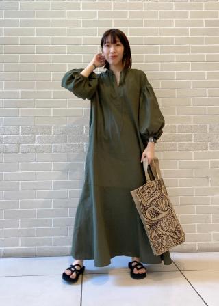 こちらはフリーサイズで着丈は長め。152cmの私だと床スレスレです。身幅にもゆとりがあるので、お胸やお尻が気になる方にもおすすめです。前のスキッパーの空きは深くなく、紐は結ばず自然に垂らすのがおすすめです。
