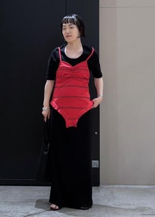 ヒップにかけて身体のラインを拾いすぎない素材感とシルエットに仕上げました。