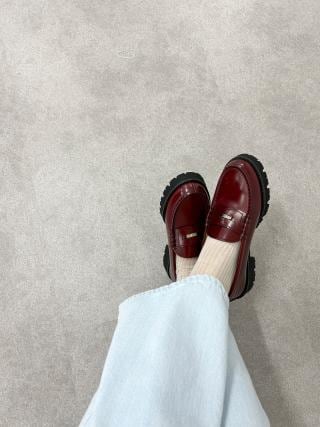 光沢のある牛革で、高級感があります。しっかりとしたソールですがとても履きやすいです。光沢とSALONのチャームの相性も◎
