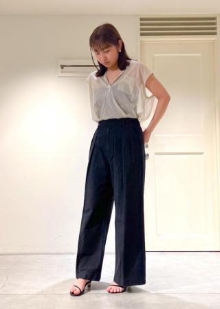 肩から腕に少しお袖がかかる長さで、やや二の腕カバーできます。身幅や身頃は割とゆったりな印象。胸元のVの空きはデコルテが見えてヘルシーです。