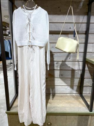 同素材のリブチューブトップをレイヤードしたアンサンブルスタイルもオススメ。