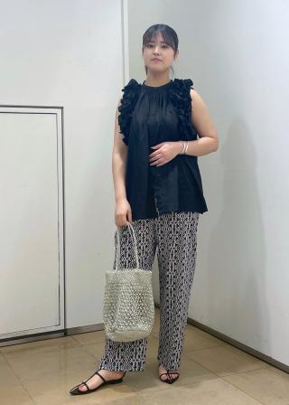 ノースリーブの肩周りにフリルがあしらわれていて可愛らしいデザイン。ボリュームに目がいくので、腕を出すのが苦手という方にもおすすめです!
