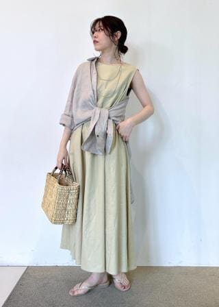 同素材のワンピースとレイヤードしたセットアップスタイルもオススメ。