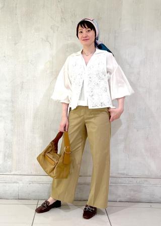 元々シボ感のある素材なので、シワも目立ちにくく、前をインしなくてもダボっとした印象にならずスタイルが綺麗に見えるブラウスです♪
