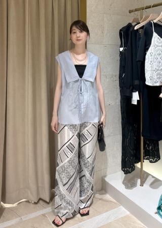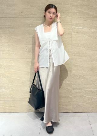 ジレとしても着用できる2WAY仕様で、夏のレイヤードスタイルに最適。上品な光沢感と軽やかな着心地が魅力のノースリーブブラウス