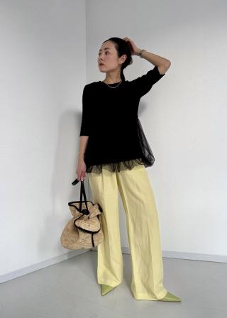 程よい肉感があるので体のラインもひろいにくく、長いシーズン着用可能な素材感。
