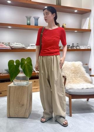 ボトムはリラックスしたパンツやデニム、ハイウエストのアイテムにインしても。