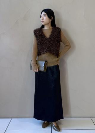 冬のレイヤードスタイルに華やかさをプラスしてくれる、クロップド丈のシャイニーなベスト。
