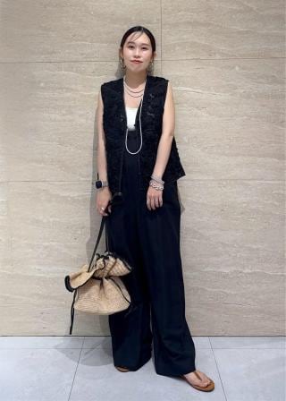 腰骨あたりのやや短めの着丈で、ワイドパンツともバランスが取りやすい長さです。身幅は程よくフィットしつつもピタッとしすぎず、立体的な素材感のおかげで身体のラインを拾いにくいです。袖はノースリーブですが、肩に少しかかるくらいのカッティングで上品に見え、ウエスト周りもストレートシルエットなので締めつけ感はありません。