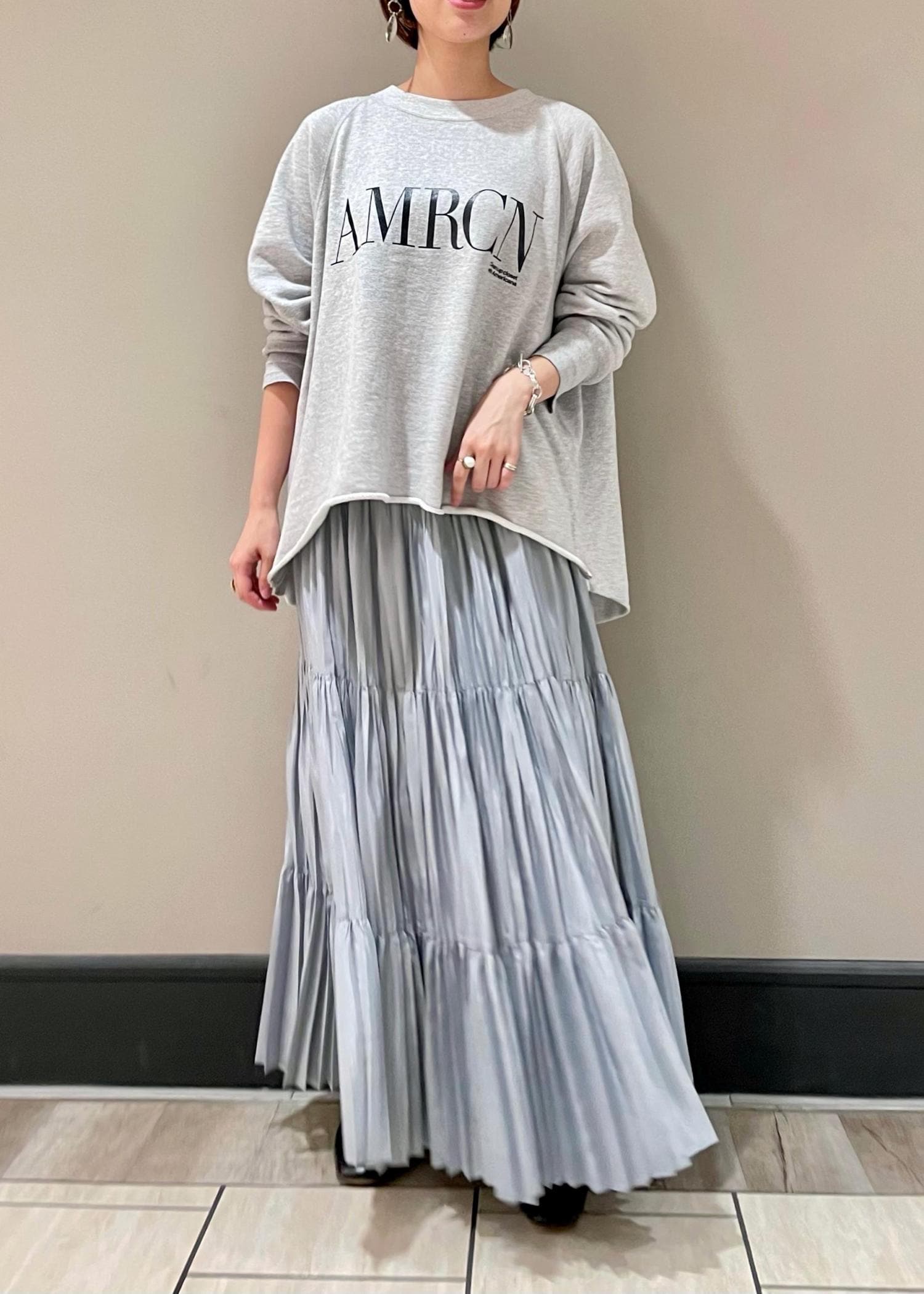 店頭でも大人気のAmericanaの新作を、 フェミニンにティアードスカートと合わせました◎ スウェットのようなカジュアルな素材感なので、 スカート合わせでも甘くなりすぎません! ブーツを履いて、お出かけしたくなりますね。 LINEでサロン アダム エ ロぺ ルミネ横浜店スタッフに相談は【友達だち追加】をタップをして下さい